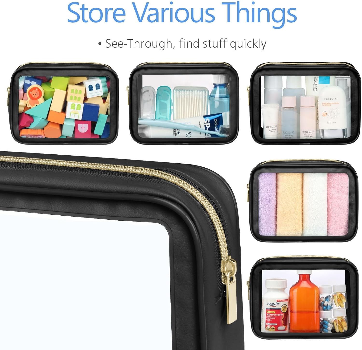 - Upgrade Colored Edge: Setting itself apart from the generic fully clear bags, our clear travel bags for toiletries upgrade a trendy black edge. Not only enhancing the appearance but also providing stain resistance, The transparent PVC material is an added bonus for easy cleaning. NOTE: The colored edge is NOT leather