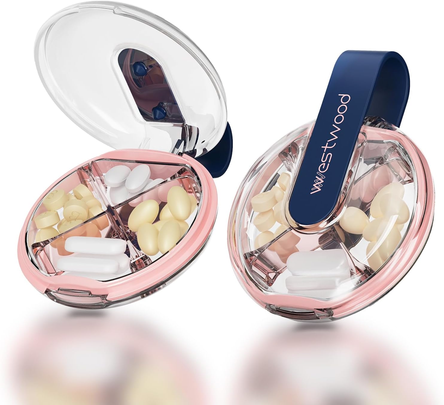 1 Pack Easy-to-Hold Small Round Blue Pill Organizer with Decorative Strap, 4 Compartments, Compact Travel Pill Box Case, Portable and Moistureproof to Store Vitamins, Medication and Supplements