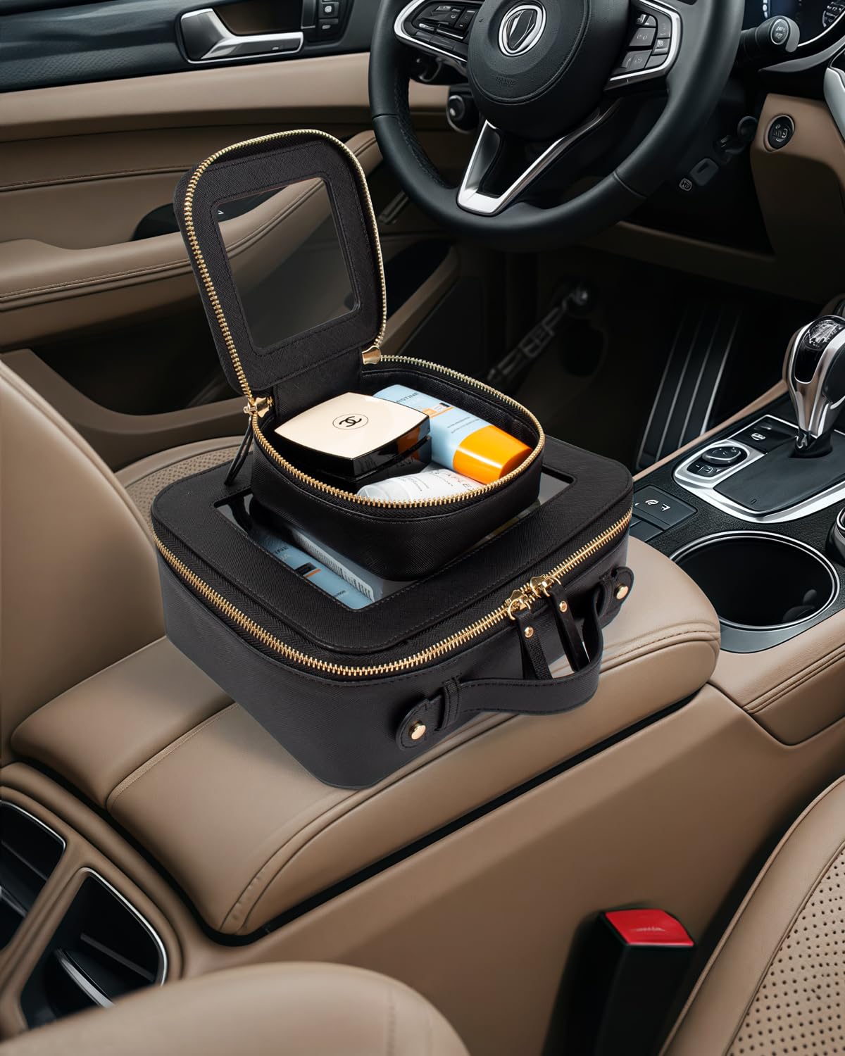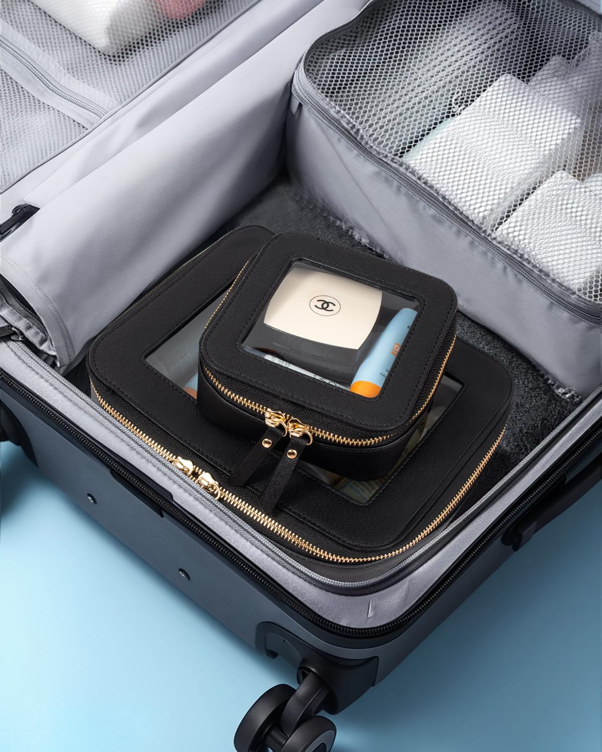 - ✈️CAR MUST HAVE ESSENTIALS CLEAR MAKEUP BAG : Large Size Measuring 9.84'' x 7.67'' x 3.14''(25cm x19.5cm x 8cm), Mini Size 5'' x 4.7'' x 2''(12.7cm x 12cm x 5cm), our clear makeup bag is elegant ,and stylish, this makeup travel organizer was designed in a minimalist boxy shape and Crafted in beautiful PU leather and finished with polished hardware, the trendy makeup bag is easy to carrying in your handbag or carry-on.