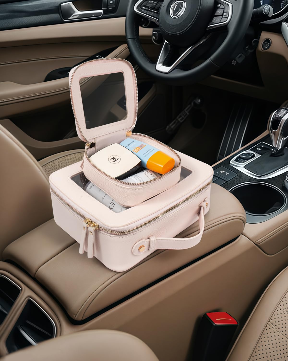 - ✈️CAR MUST HAVE ESSENTIALS CLEAR MAKEUP BAG : Large Size Measuring 9.84'' x 7.67'' x 3.14''(25cm x19.5cm x 8cm), Mini Size 5'' x 4.7'' x 2''(12.7cm x 12cm x 5cm), our clear makeup bag is elegant ,and stylish, this makeup travel organizer was designed in a minimalist boxy shape and Crafted in beautiful PU leather and finished with polished hardware, the trendy makeup bag is easy to carrying in your handbag or carry-on.