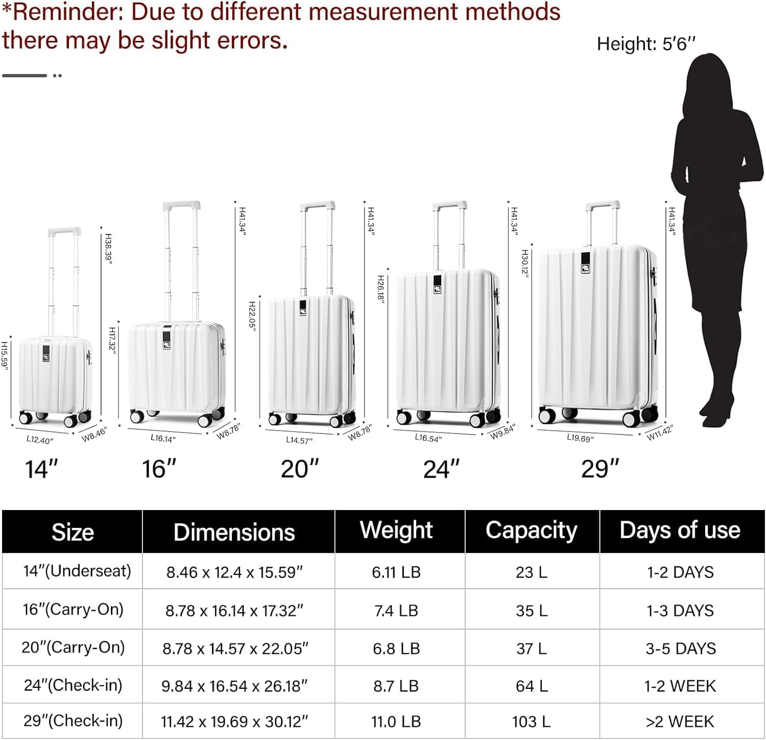 - 【Product dimensions】Nestable storage 2 Piece Set 20/29 Inch. Including wheels and handles(can ont expandable),20 inch Carry on luggage airline approved : L13.46 x W8.78 x H21.46", 37L, 6.8LB,can fit in the overhead bin;29 inch Checked in luggage airline approved : L19.69 x W11.42 x H30.12", 103L, 11LB.