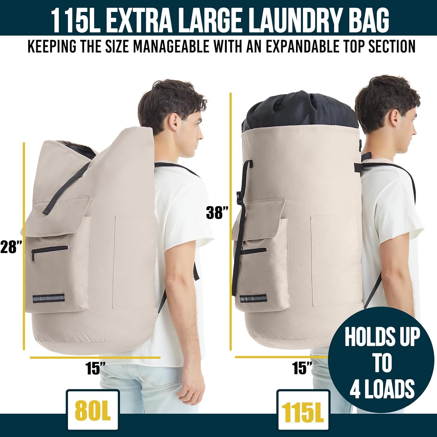 Laundry Bag Extra Large Heavy Duty, 115L Laundry Backpack, College Laundry Bag with Straps, Backpack Laundry Bags with 4 Pockets, Dorm Essential, Laundry Bags for Dorm Room, Apartment, Laundromat