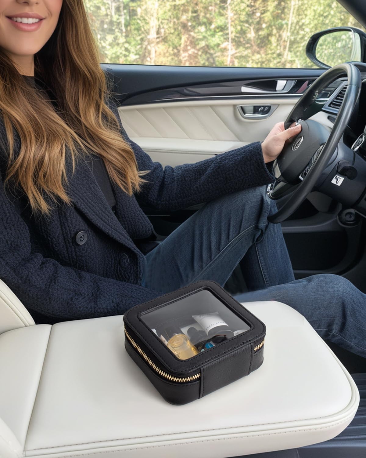 • Car Must Have Essential: Our car essentials small pouch travel toiletry bag is roomy to store your makeup brushes, lipstick, eyebrow pencil, make-up foundation, cables, chargersor and other little items.It make your daily make-up, cream, lipstick, perfume and other beauty things organized and protected.This clear mini toiletry bag can be a good car accessory fits in the center console or other parts of your car