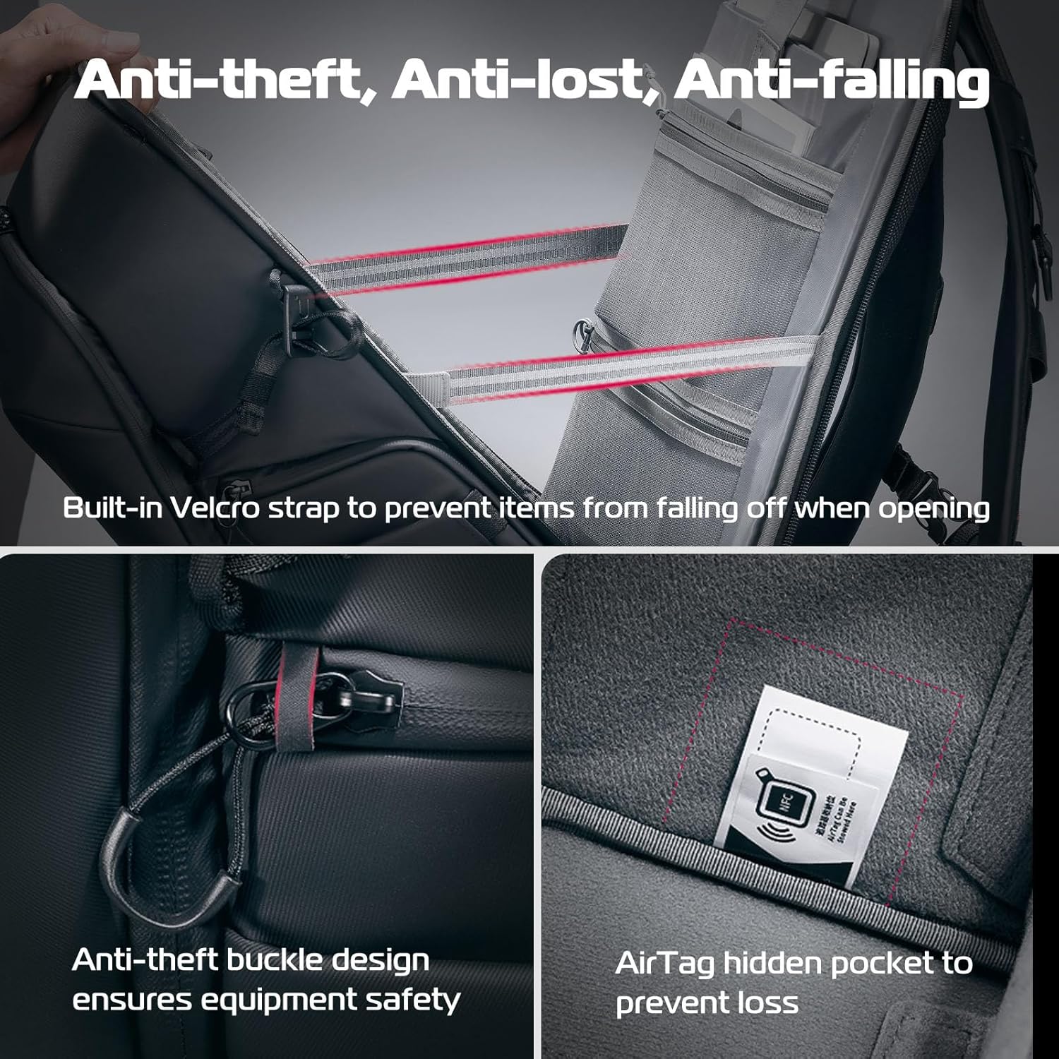 - 【Rich Internal Structure】There is a dedicated inner bag and multiple small mesh pockets inside, which can accommodate a 15.6-inch laptop or tablet/iPad. The bottom strap is for mounting a tripod. The front of the camera gear backpack has a zippered pocket for accessories. The side zipper opening provides quick access to the camera.