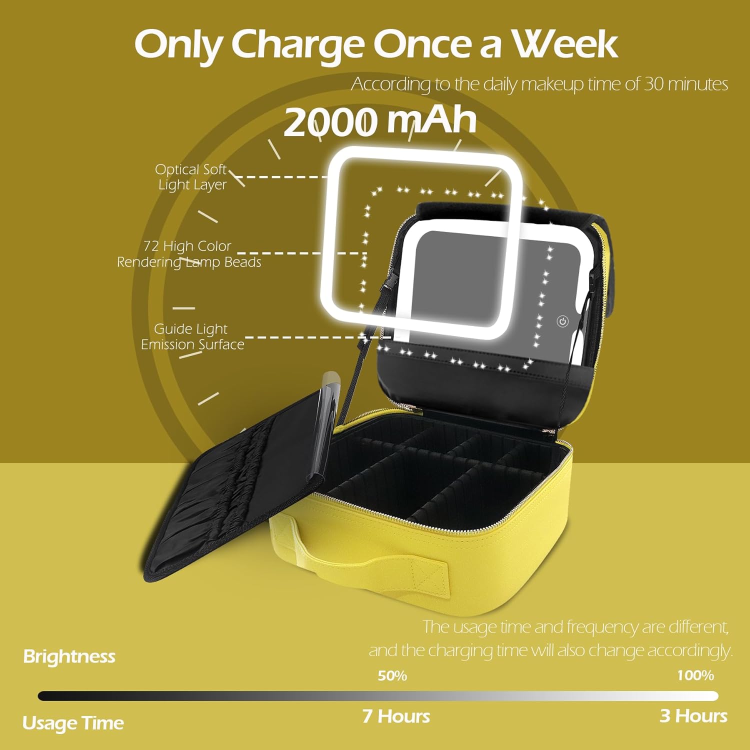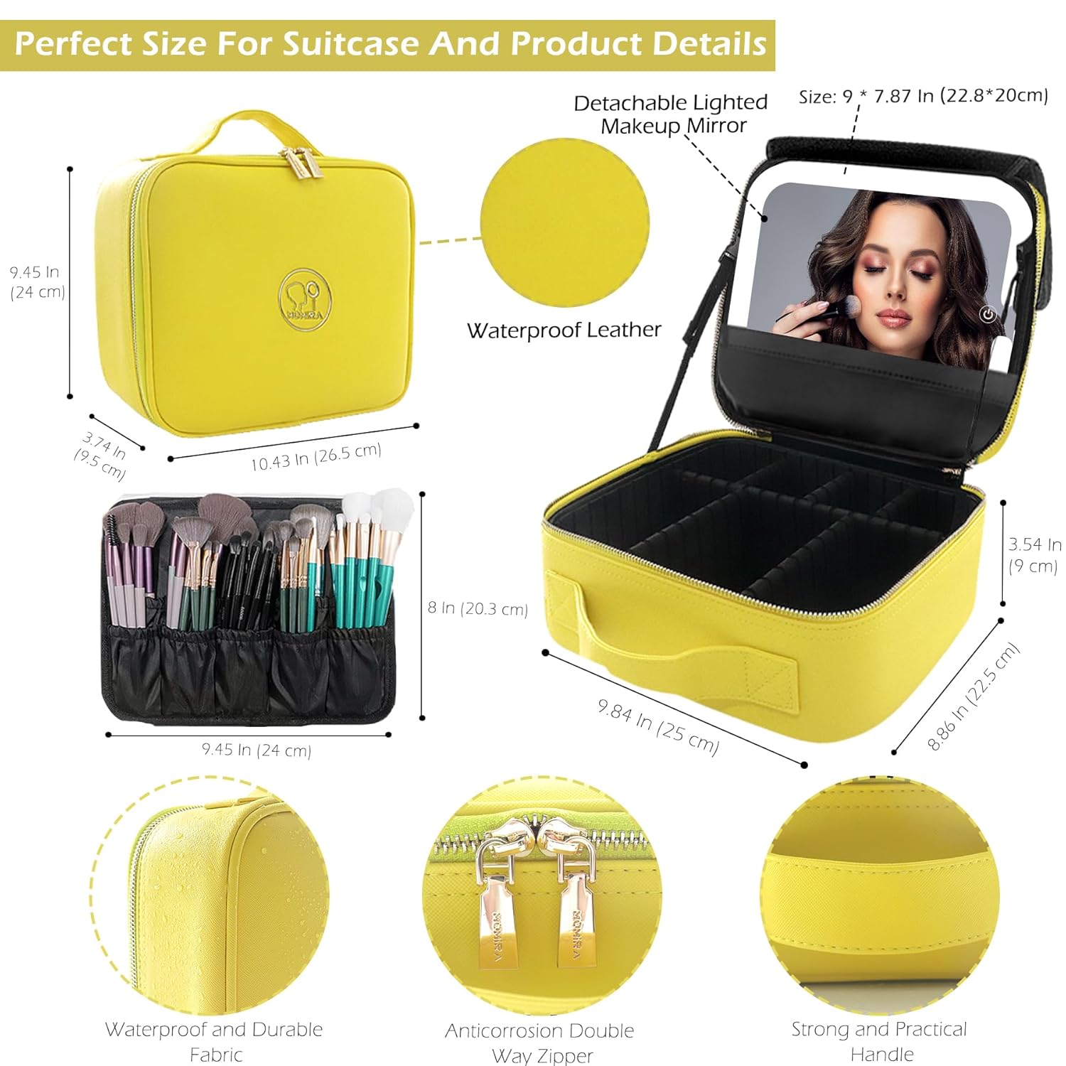 MOMIRA Travel Makeup Bag Cosmetic Bag Makeup Organizer Bag with Large Lighted Mirror 3 Color Scenarios Adjustable Brightness,Yellow
