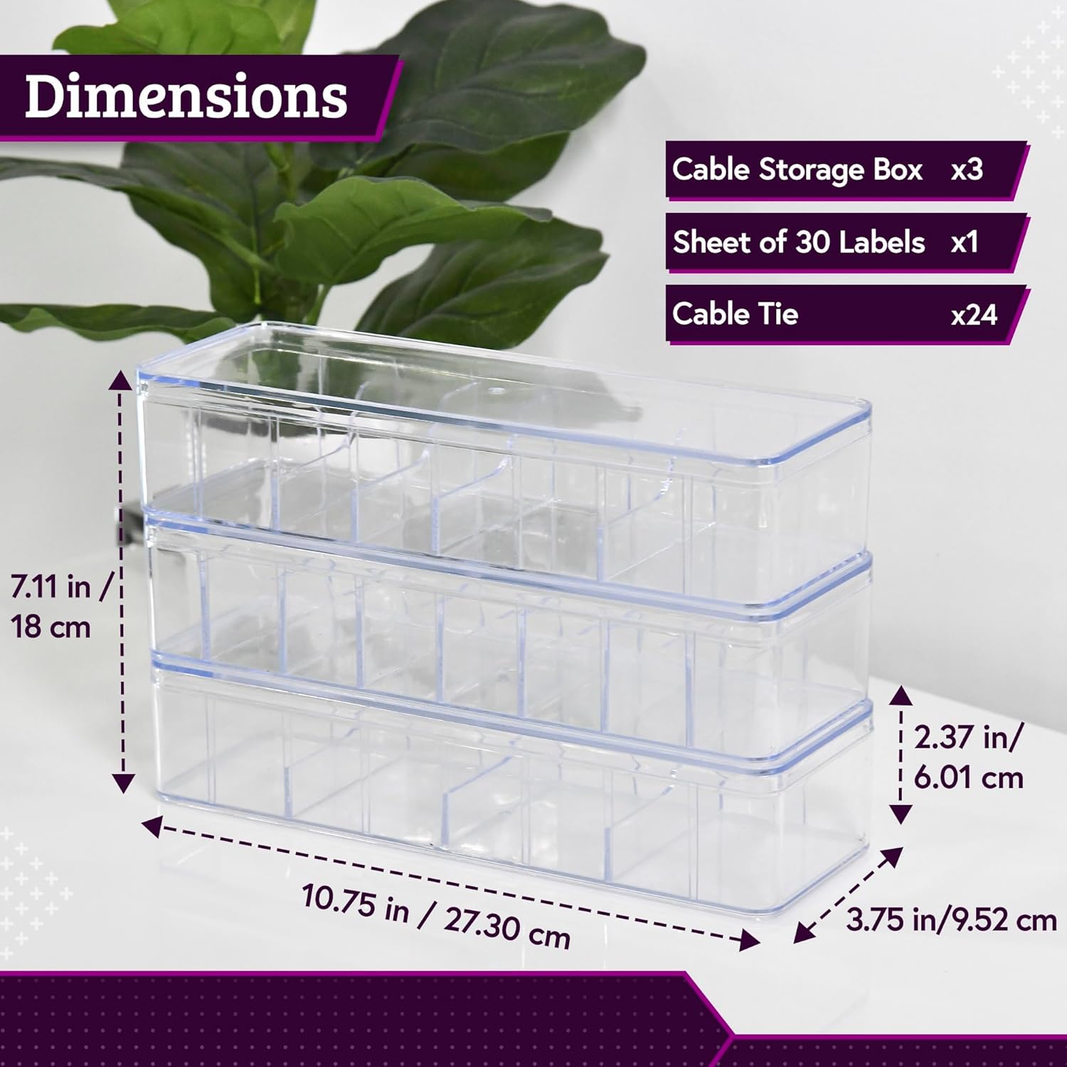 - The package: Includes 3 pcs Cord Organizer Box with Lids, 24 White Rubber Cable Ties, 1 Label Sheet with 30 Images of USB types cables. Our Cord Management Box helps to keep your USB cables and similar accessories in our acrylic cable management box for safe keeping and easy retrieval from your drawer. This wire organizer box comes with a sheet of labels for easy identification of your USB cables. Each Box measures (10.75β x 3.75β x 2.38β).