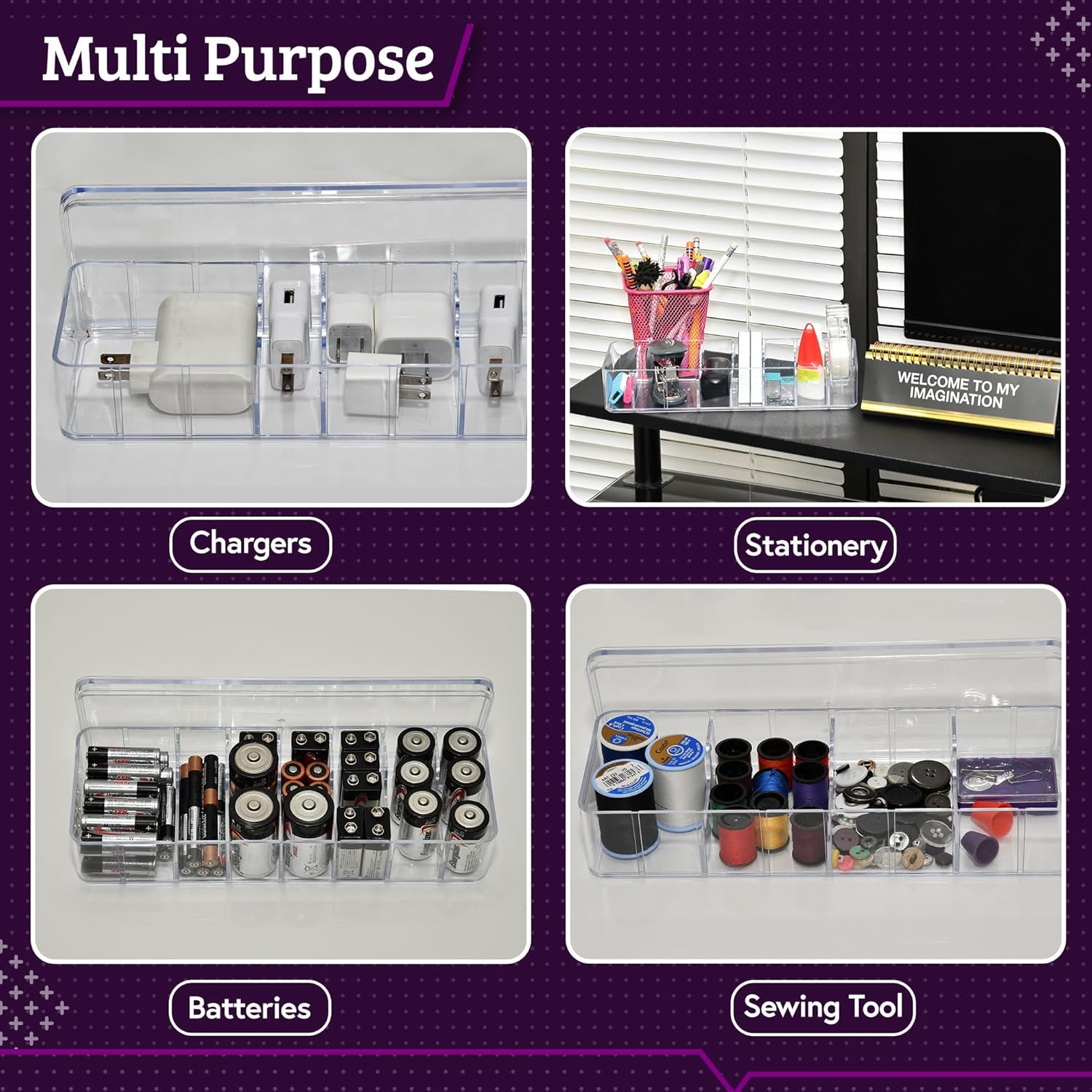 - The Extra: This cord box organizer comes with a sheet of 30 labels with images of the most common USB cable types. Versatility is the word to describe it. The wire box can be used to storage not only cables but a wide range of products like small sewing kits, small craft materials, hair accesories, jewerly, school supplies, office supplies, etc. The 24 compartments of our charger organizer box offer ample space to store multiple items in each compartment without overcrowding.