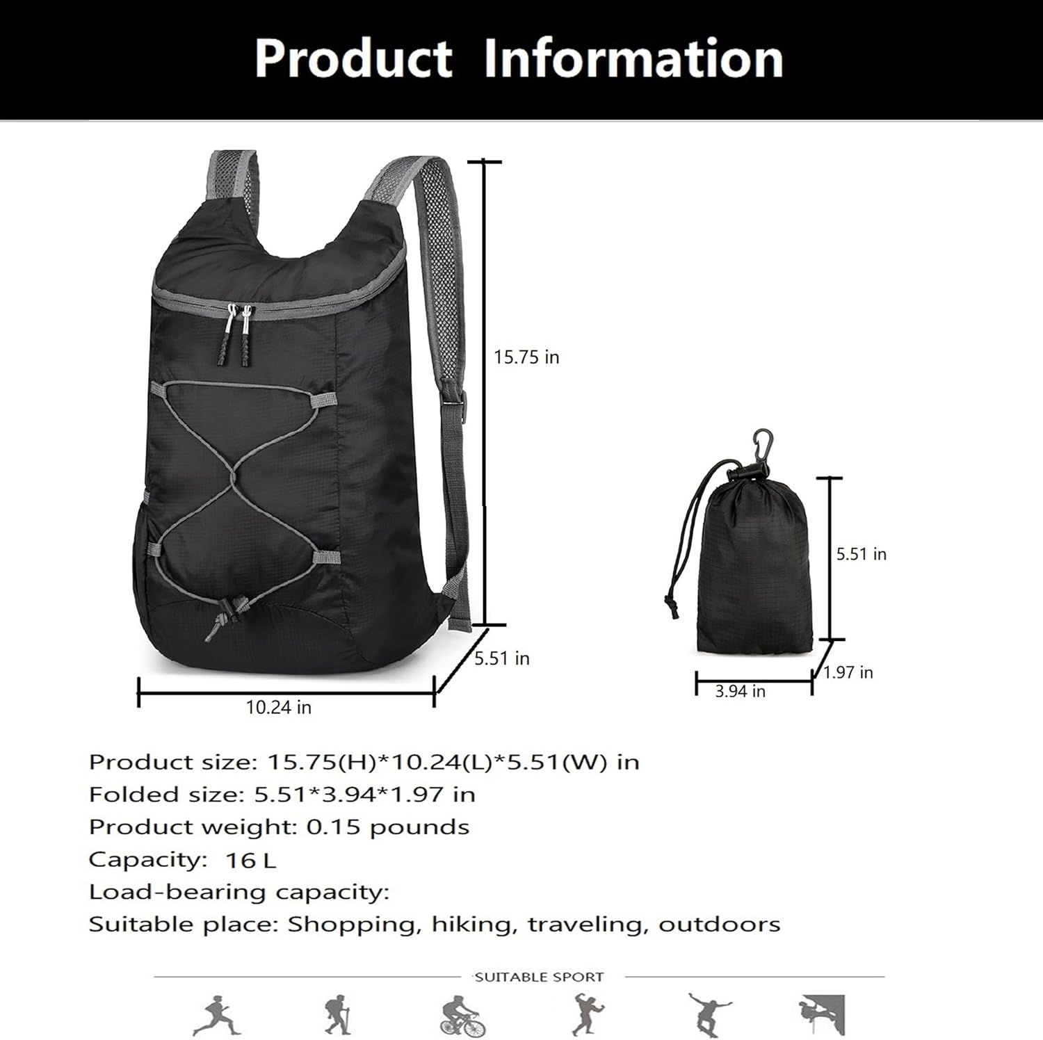 - LIGHTWEIGHT &16 L CAPACITY:The lightweight hiking daypack weighs only 2.82 ounces.unfold size:10.23 (L)*15.75(H)*5.51(W) inches,after folding size:3.94 (L)*5.51(H)*1.97(W) inches,the bag folds to the size of a sandwich and fits in a pocket;The main pocket to carry what you need,side pockets for water bottles or umbrella