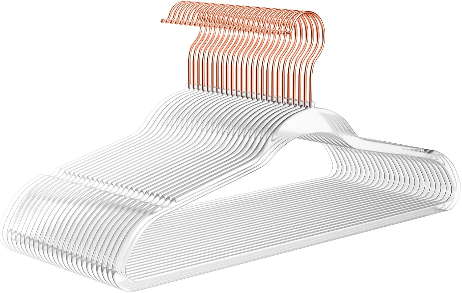 - Dorm room essentials for college students【Full Adult Standard Size】- (LxWxH): 17.24"x0.2"x8.7" inches.Made of Top Quality Clear Plastic, Rosegold Hook.VALUE PACK of 50 pcs.Swivel Rosegold Hooks can be 360 degree rotated, which easy sorting of clothes no matter which direction you hang your clothes, strongly attached to our durable hanger so the hook doesn't detach or snap easily
