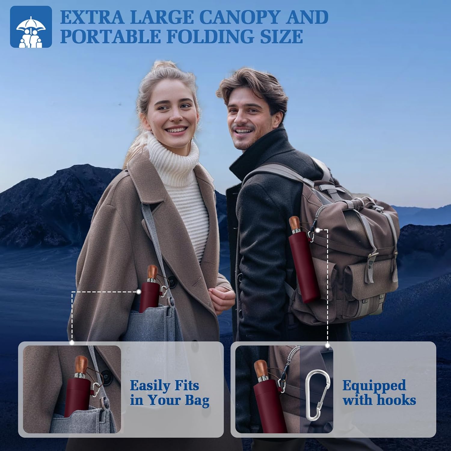 3T Wind Armor Travel Umbrella Compact Easy Auto Open Close Folding Umbrellas for Rain Windproof Umbrella for Women and Men Durable Real Wood Handle Portable Fits Backpack Car