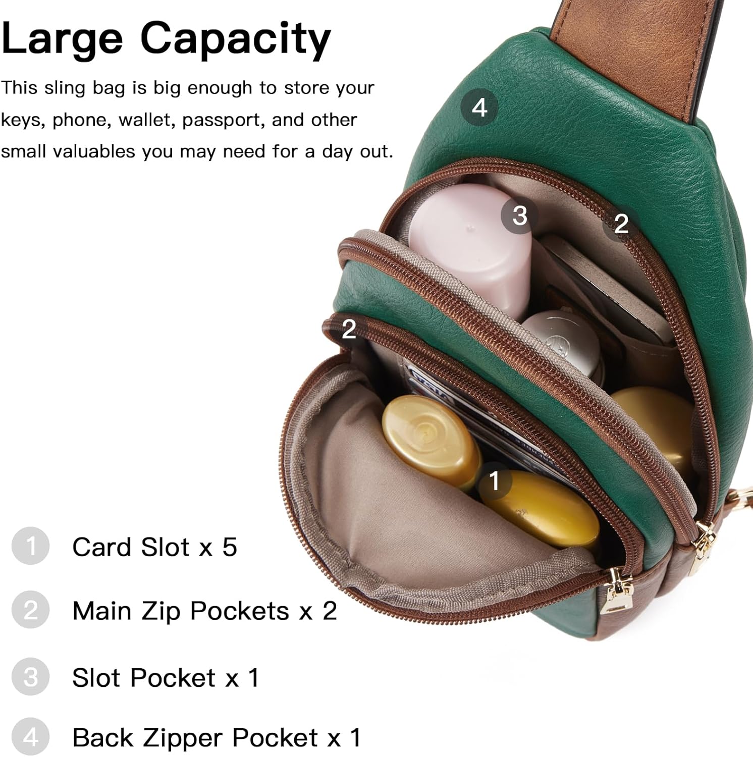 - Multi-functional: Comes with two main compartments, including five card slots in the front zip pockets, and a big slot pocket in the back. Moreover, there also have an anti-theft zipper pocket in the back to keep your belongings secure. This leather sling bag is the perfect everyday essential. It's just big enough to store your keys; phone; wallet; passport and other small valuables you may need for a day out, allowing you to move freely while having quick and easy access to your belongings