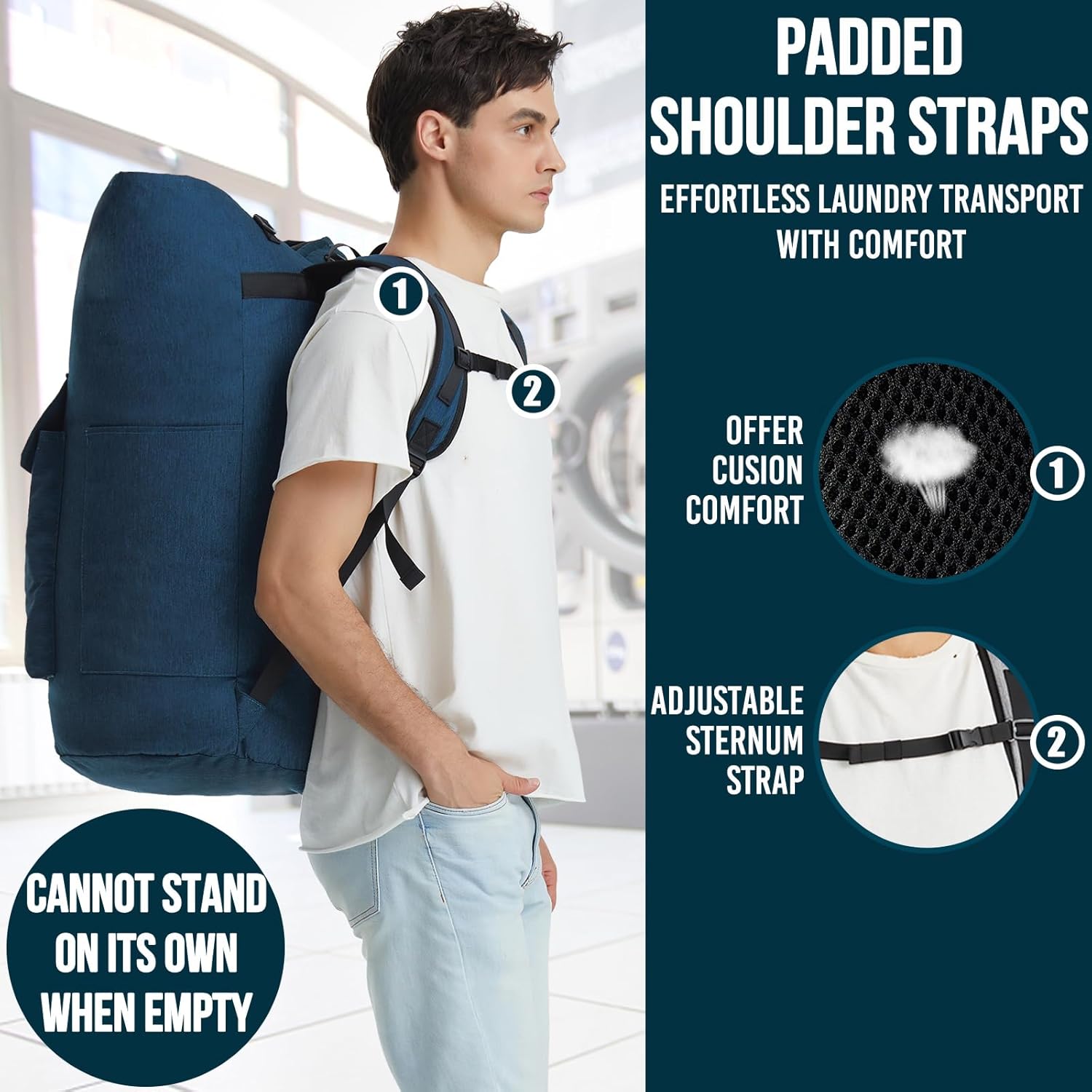 - Effortless laundry transport with comfort: Featuring thicker padded shoulder straps, along with an adjustable sternum strap, the laundry bag backpack makes carrying laundry a breeze; Whether youâre taking your laundry going up and down stairs to the basement of your building or maneuvering through busy sidewalks to the nearest laundromat, our backpack laundry bag allows you to carry the heavy load on your back; This way, you can keep your hands-free to text, open doors, or grasp stair railings