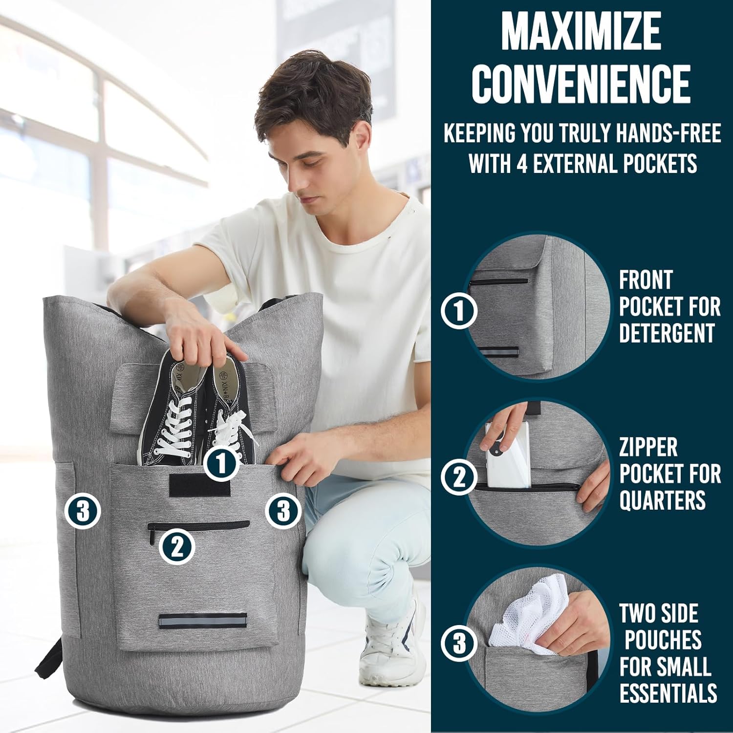 - External 4 Pockets and Night Security: The laundry bag with straps offer external storage with a spacious pocket for detergent and fabric softener, ensuring they don't encroach on the main compartment; Plus, a front zipper pocket provides convenient space for keys or quarters, while two large side pouches accommodate various small items, keeping your belongings organized and easily accessible; The heavy duty laundry bag also includes a reflective bar to enhance your safety during the night
