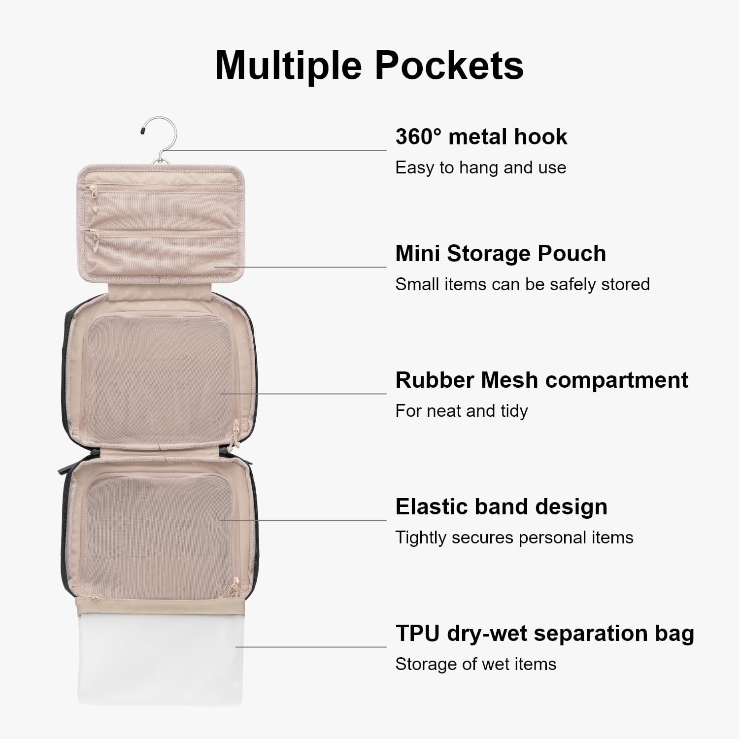 - Multiple Pockets: Including mini storage pouch, rubber mesh compartment, elastic band compartment and TPU dry-wet separation bag, which can hold your full-sized travel essentials