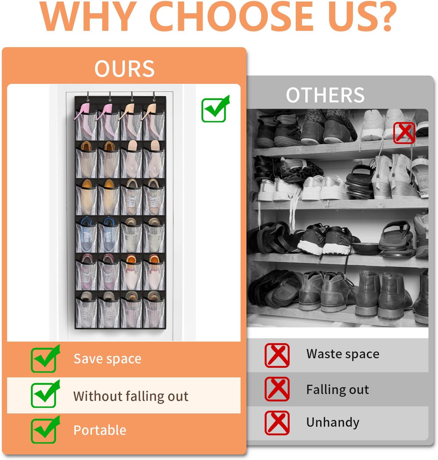 - Maximize Storage & Save Space: Our door shoe organizer makes the most of vertical space, freeing up floors and walls. It is perfect for small spaces like entryways, closets, bedrooms, apartments, and dorms. Designed to increase storage capacity, hanging shoe organizer helps keep your home neat and clutter-free.
