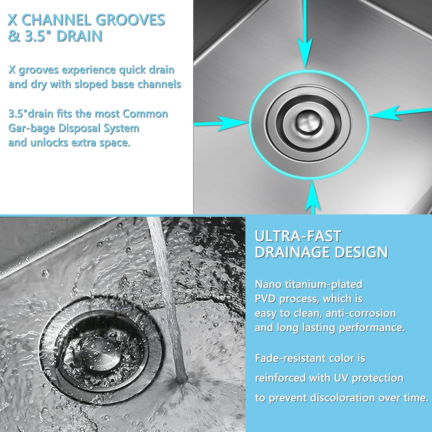 - [Fast & Complete Drainage Design]: This 15 inch bar sink is designed with slopped bottom and X-shaped drain grooves that ensure draining water quickly and prevent water pooling. Standard 3.5" drain openings will fit any garbage disposal unit.