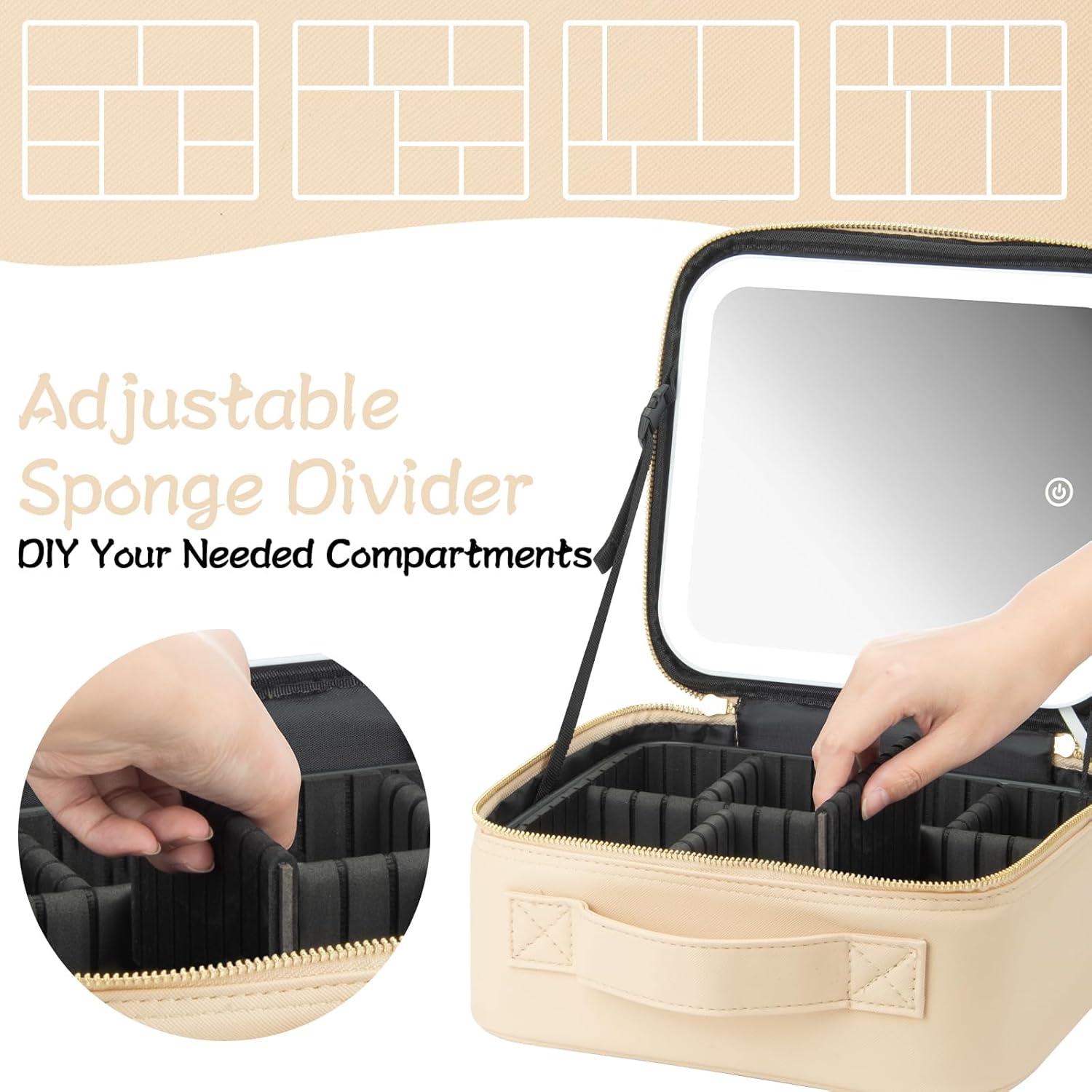Makeup Travel Train Case with Mirror LED Light 3 Adjustable Brightness Large Cosmetic Bag Portable Storage Adjustable Partition Waterproof Makeup Brushes Make up Jewelry Gift for Women