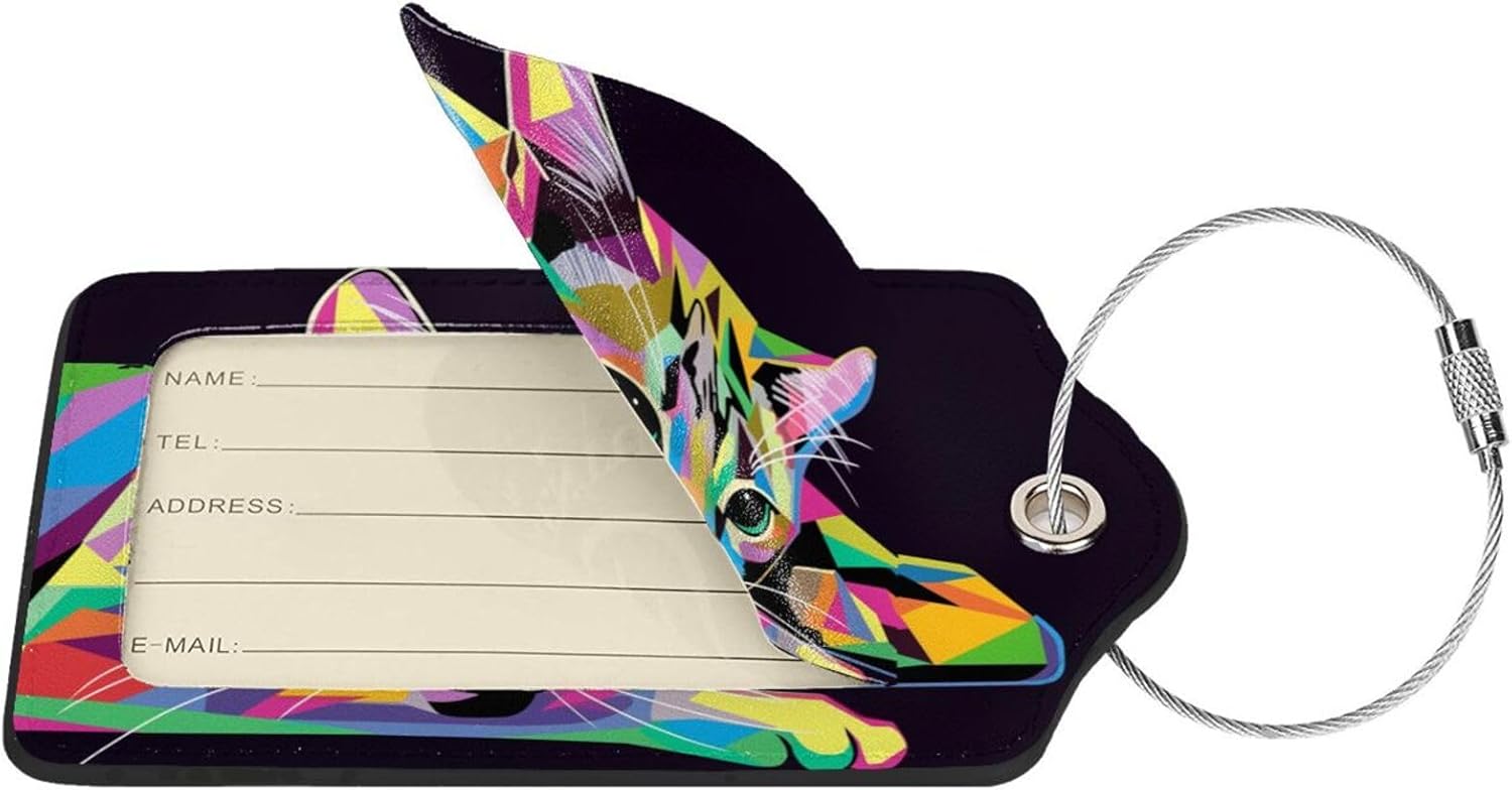 Cat Leather Luggage Tag with Stainless Steel Ring, Fun Name Id Card Cover Travel Bag Tag Set, Suitable for Travel Bag Luggage Women Men 2 PCS