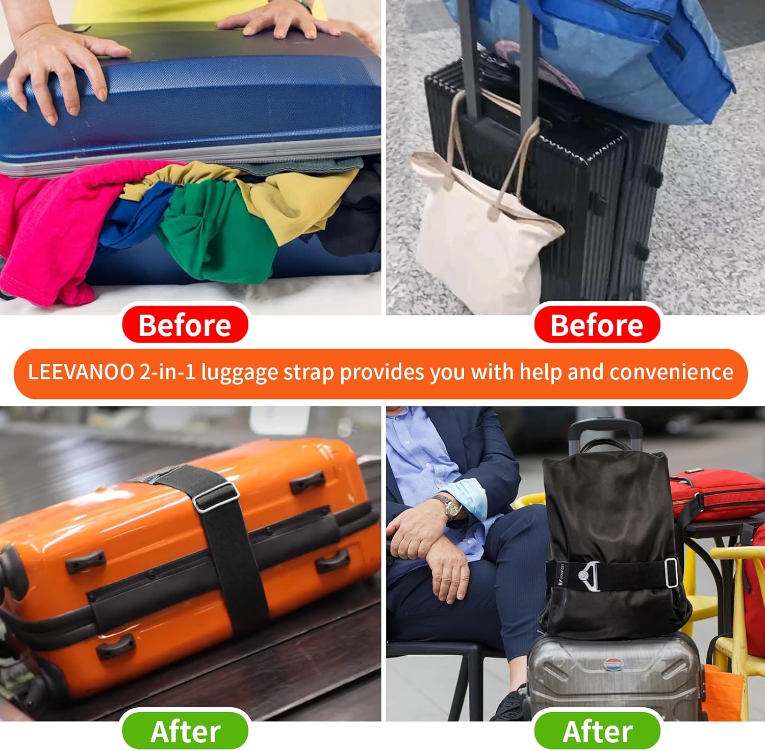 - 【Gift and Convenience】This luggage strap adds a bag to your suitcase, it is a very practical travel necessity that will bring a lot of convenience to traveling. First, slide the luggage strap onto the handle of the suitcase; second, fasten it with the alloy buckle.LEEVANOO 2-in-1 Luggage Strap provides you with help and convenience, and it can also be used as a gift for your family and friends who love traveling.
