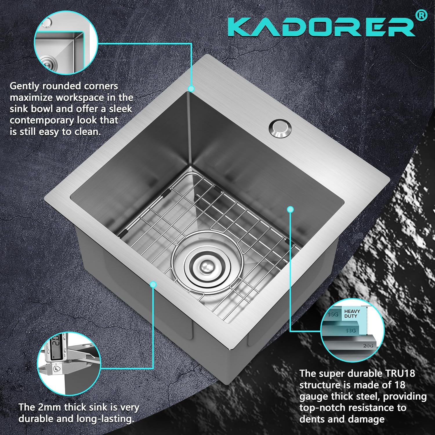 15 x 15 Inch Drop In Bar Sink, Small Kitchen Sink Single Bowl Topmount Bar Prep Sink 18 Gauge Stainless Steel Bar Sink with Grid and Basket Strainer