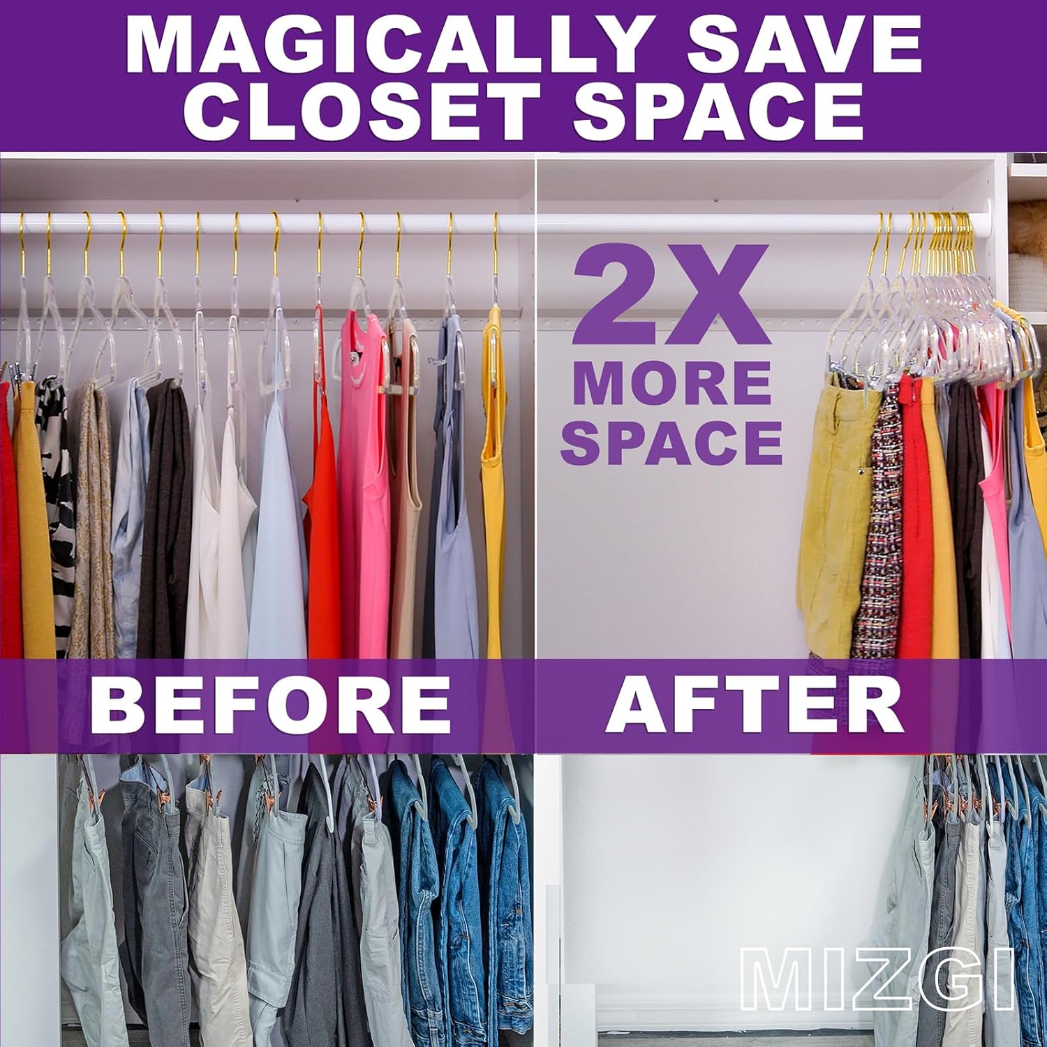 - 【ULTIMATE STYLE & LUXURY】- Introducing MIZGI's latest innovation in space-saving hangers: the completely clear and invisible hangers. These luxurious hangers not only maximize your closet space but also add a touch of style and elegance, transforming any ordinary closet into a millionaire wardrobe. INVISIBLE HANGERS design seamlessly blends with any home decor, creating a cohesive and sophisticated look.