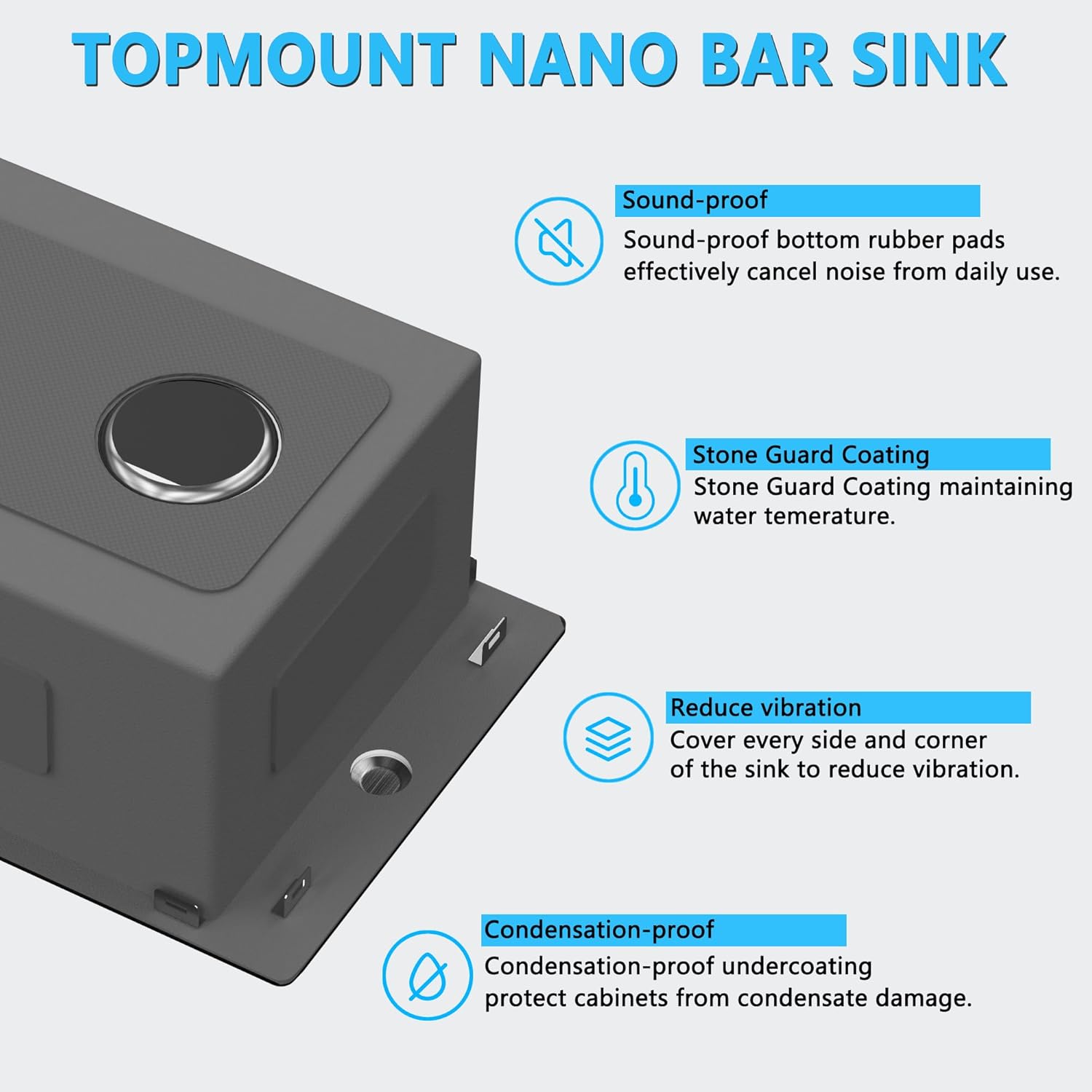 - [Small Kitchen Sink Package Contents]: Our drop in bar sink is made of premium 18 gauge stainless steel and extra 2mm thick sink panel. Package includes 15" x 20" drop in bar sink, basket strainer drain assembly, cutout template, mounting clips for your easy installation.