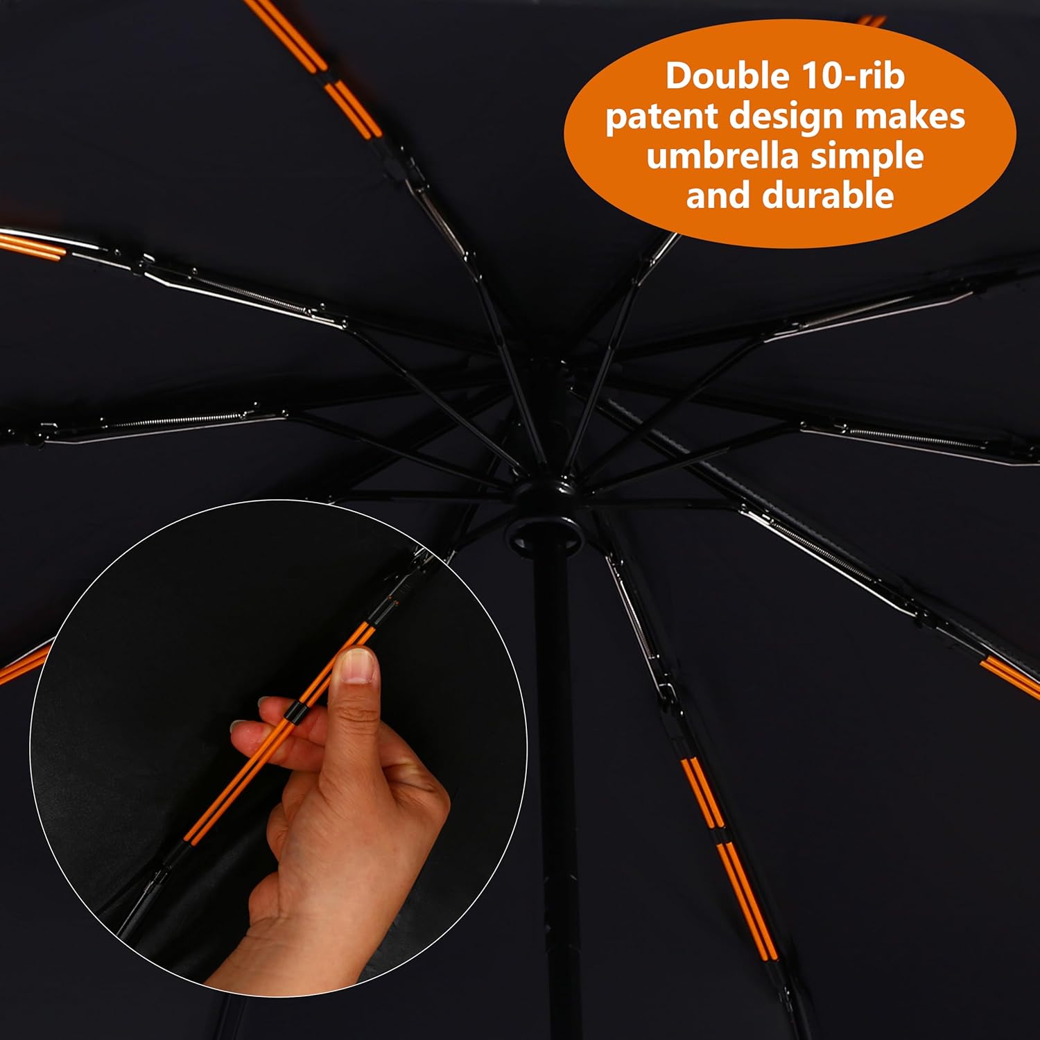 - SIMPLICITY AND DURABILITY: Our compact travel umbrella features a balance of simplicity and durability with its unique double 10-rib patent design. It opens and looks simply while remaining sturdy and durable, capable of withstanding strong winds, furthermore, which has an integrated rubberized non slip handle for better grip when encountering strong winds and heavy rains.