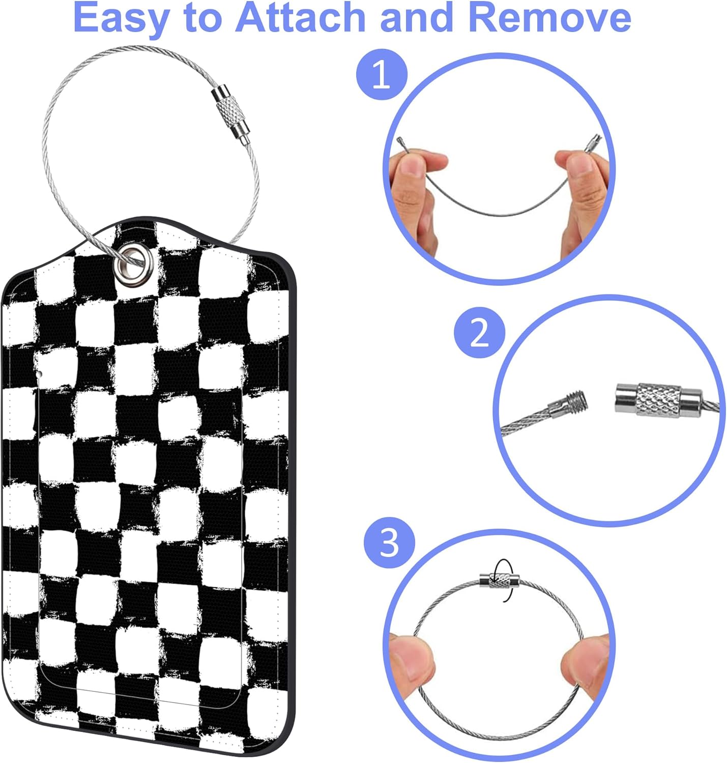 - Easy to Use: The luggage tag is beautifully made and looks strong enough. The steel ring connects your luggage and the suitcases tag tightly, is easy to install and remove, and can be reused for a long time. No more worries about accidentally losing your baggage tag! Ideal for travel bags, suitcases, school bags, sports equipment, pet bags, tool boxes or musical instrument cases, etc