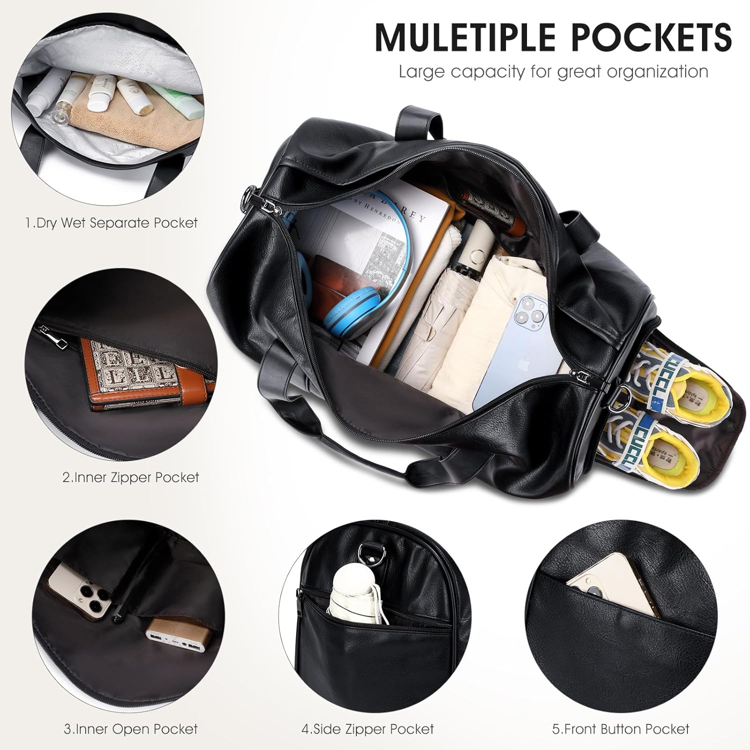 Wogarl 3PCS Leather Weekender Bag for Women Men Large Overnight Bag Travel Duffel Bag with Shoe Compartment Toiletry Packing Cube Carry On Bag Fit 21"" Laptop(Black), YT042