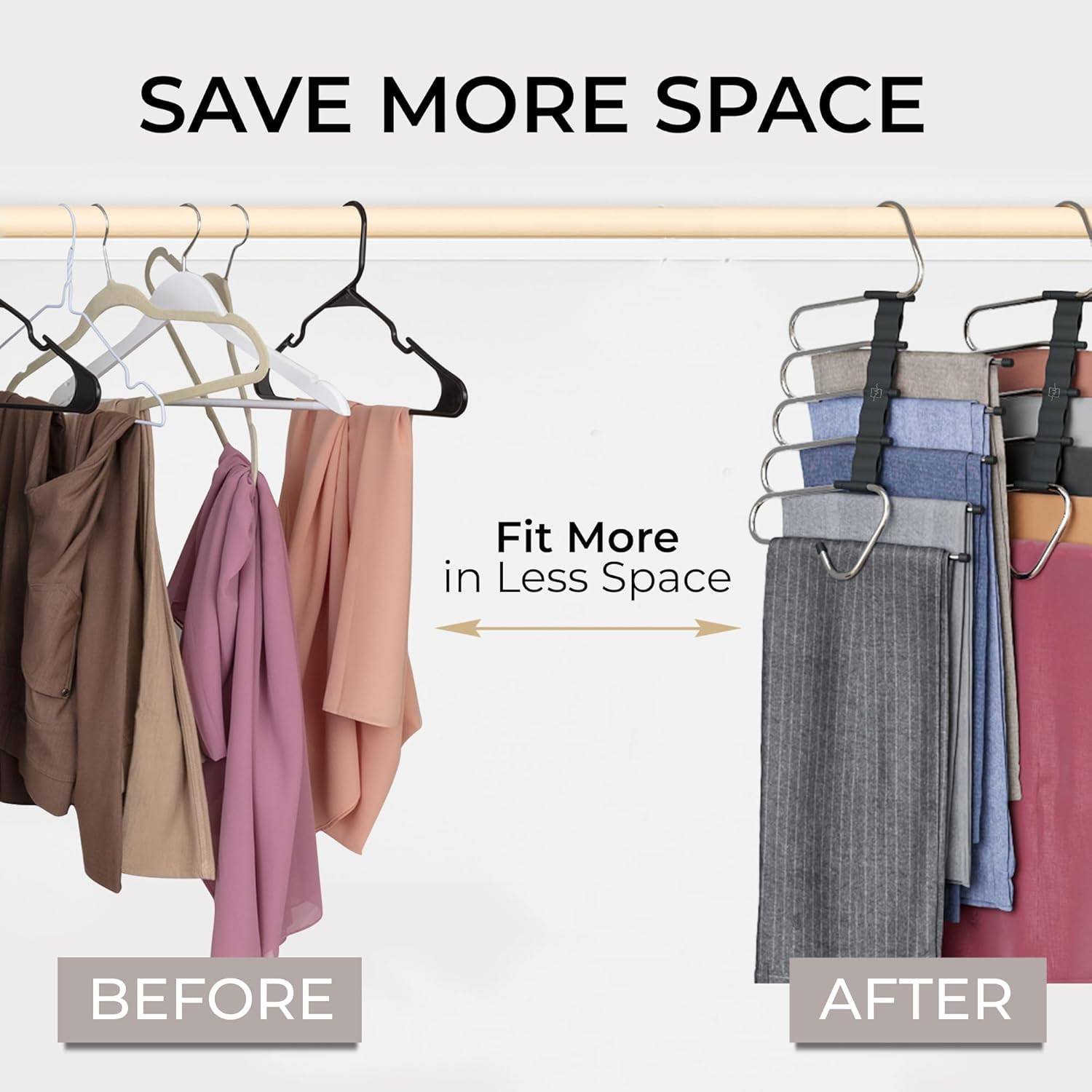 - Maximize Closet Space - Transform your closet into an organized haven with our Space-Saving Pants Hangers. Each hanger features a 5-tier design, allowing you to store more clothes in less space, making it perfect for small closets or maximizing any wardrobe.