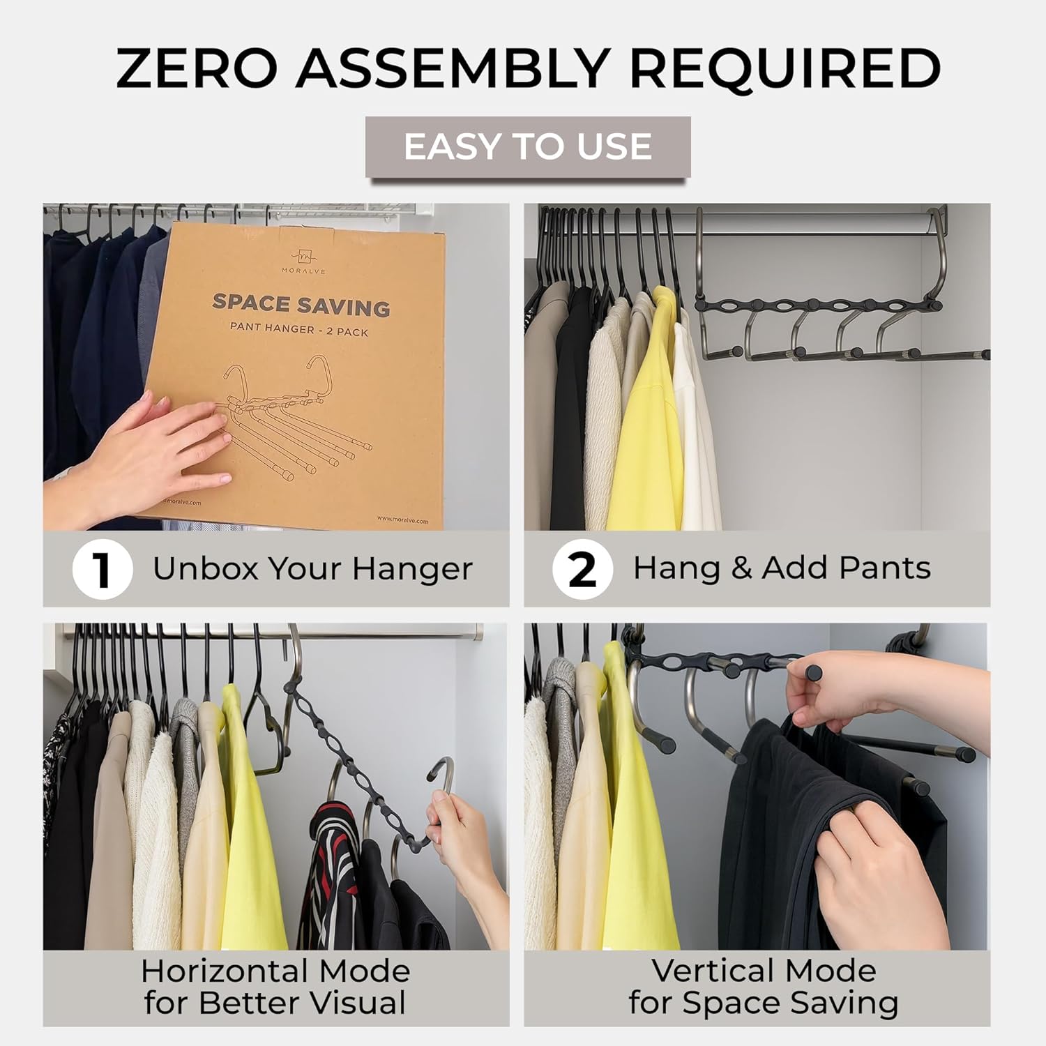 MORALVE Pants Hangers Space Saving - 2 Pack - Non-Slip Multi-Layer Space Saving Hangers - Multifunctional Clothing Rack for Closet Storage - Ideal for Jeans, Trousers, Skirts, Scarves & Slacks (Black)