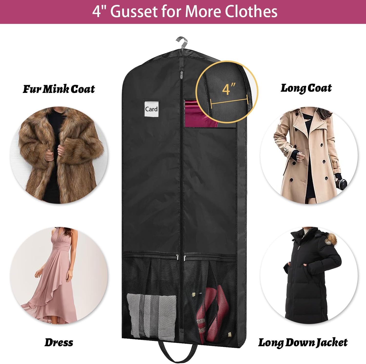 - 4" gusseted: Enables you to put multiple items in one bag. A hole in the top can hold 4 coat hangers through and hang it up in the closet.