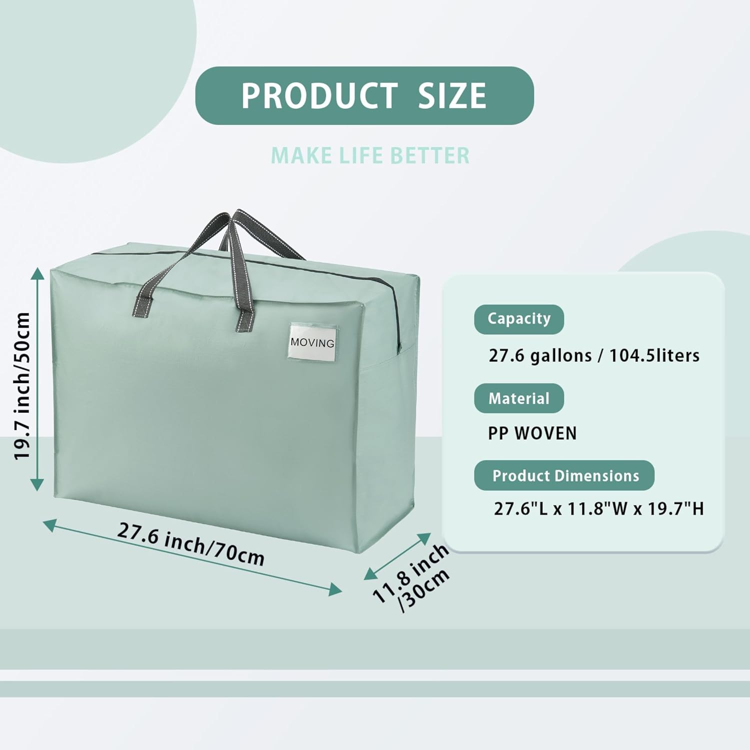 - LARGE SIZE: 27.6” W X 19.7” H x 11.8” D. 104.5 liters or 27.6 gallons of storage capacity. Spacious enough to fit various items such as clothes, shoes, blankets, bedding, comforters, pillows, towels, Christmas décor, souvenirs, gifts, laundry, camping gear, and more.