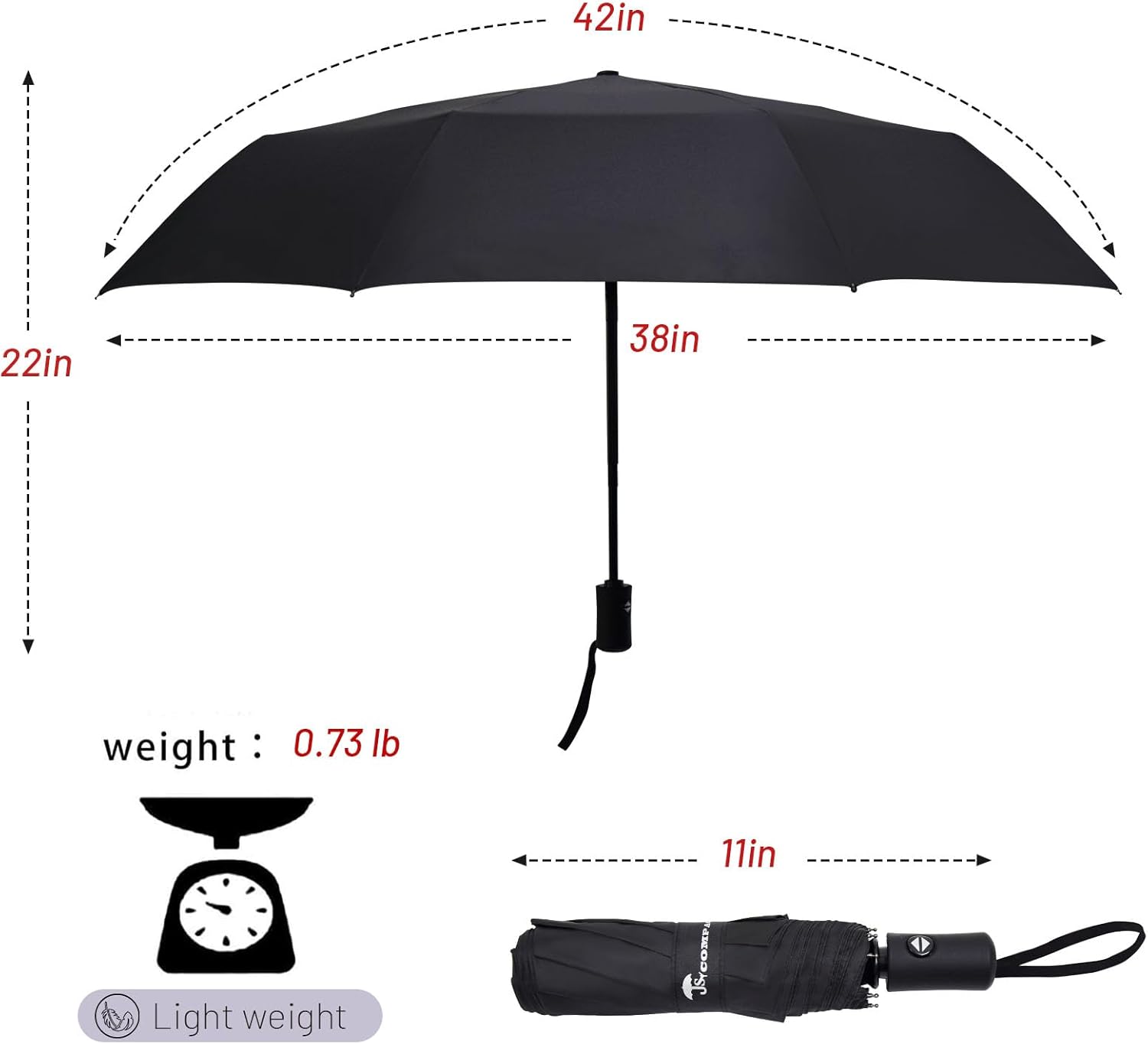 - Fully Automatic: This travel umbrella opens or closes in the blink of an eye with the push of a button. This makes it very handy for quick access to cars, buildings or tents.
