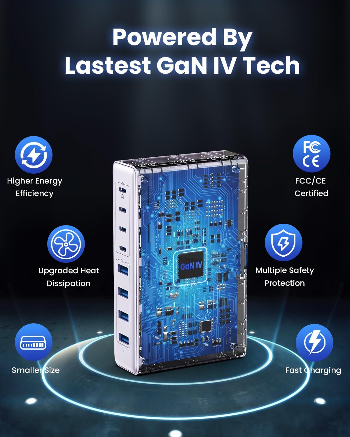 - ăSuper-Fast GaN III USB C ChargerăThe Latest Design USB Charger with 200W Total Power and Multiports, adapted GaN III generation chip technology, higher resistance to radiation, longer-lasting life, upgraded heat dissipation, faster, smaller and safer without sacrificing a drop of power. The usb ports upport advanced PPS,PD3.0 and QC4.0 technology. It built-in advanced intelligent controlling IC and multi-protection safety system to ensure safety for you and your devices.