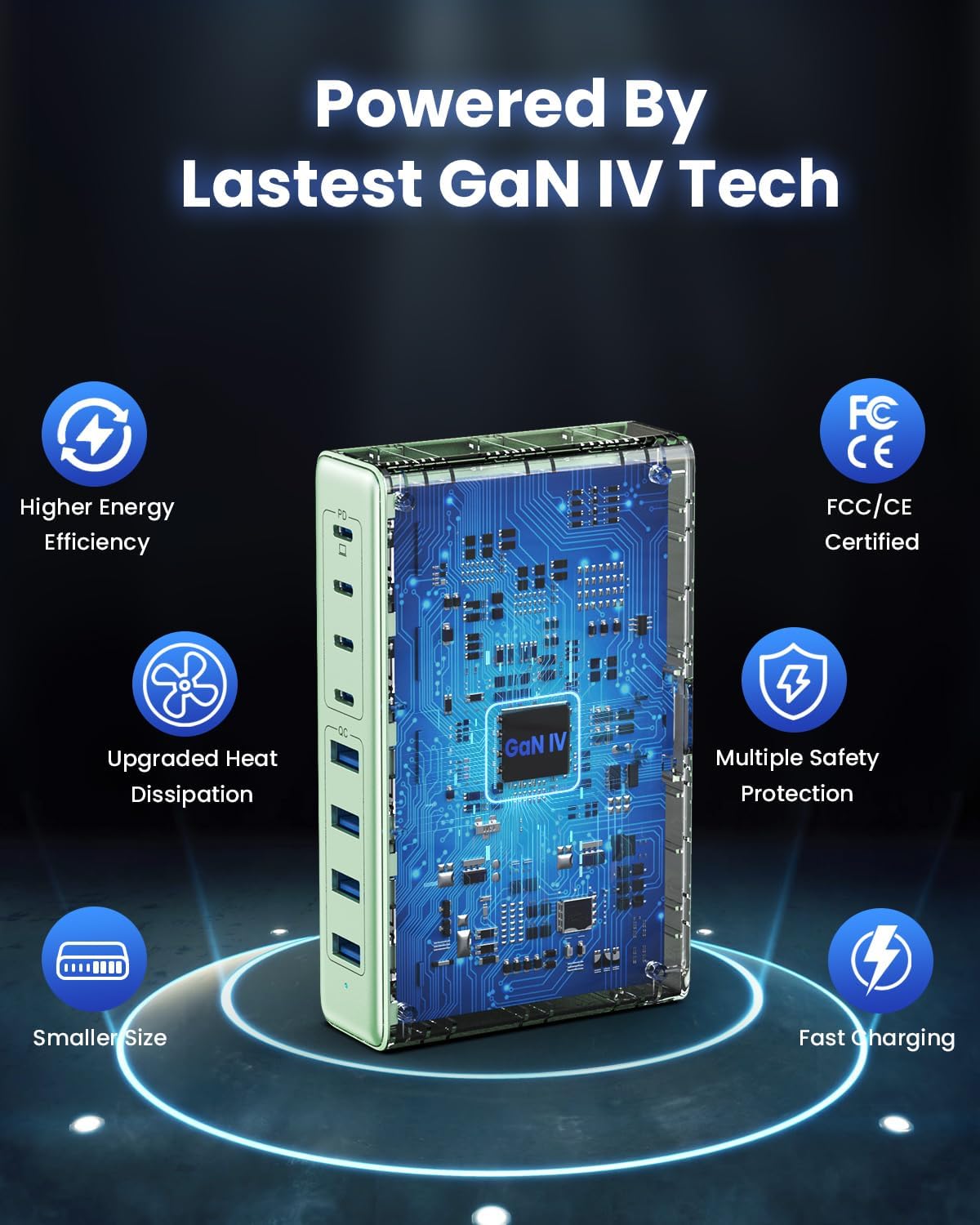200W USB C Charger Block,GaN IV Charging Station 8 Ports,QC4.0 Fast Charging Station Hub+PD 65W USB C Laptop Charger Adapter Compatible with MacBook Air/Pro,DELL,iPhone 16/15,iPad,Steam Deck-Green