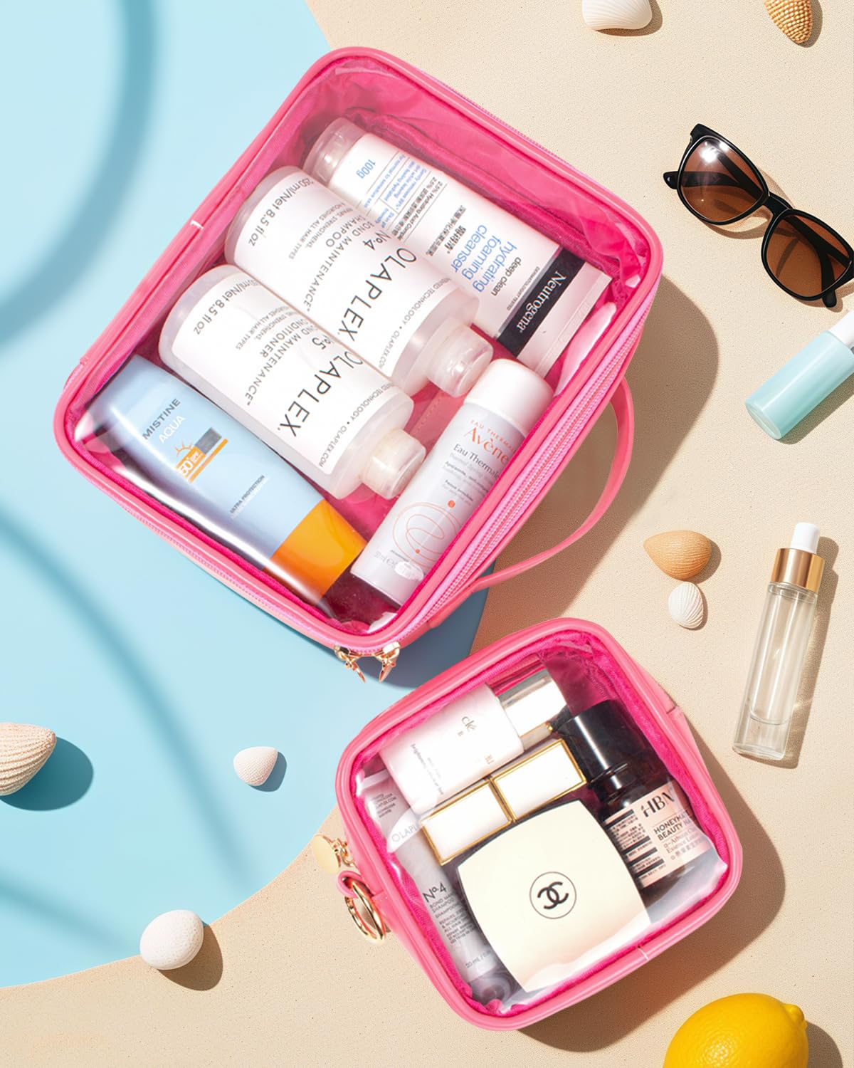 - PORTABLE & REUSABLE :Our clear toiletry bags perfectly store the travel bottles for toiletries, travel size toiletries kit, and other travel essentials,beach essetiansl. Perfect for toiletries, sunscreen for the beach, your accessories, pool accessories,bogg bag accessories,personal item, snacks, lunch, coins, hair stuff, lipstick, diaper hygiene, skincare items, or any other accessory!