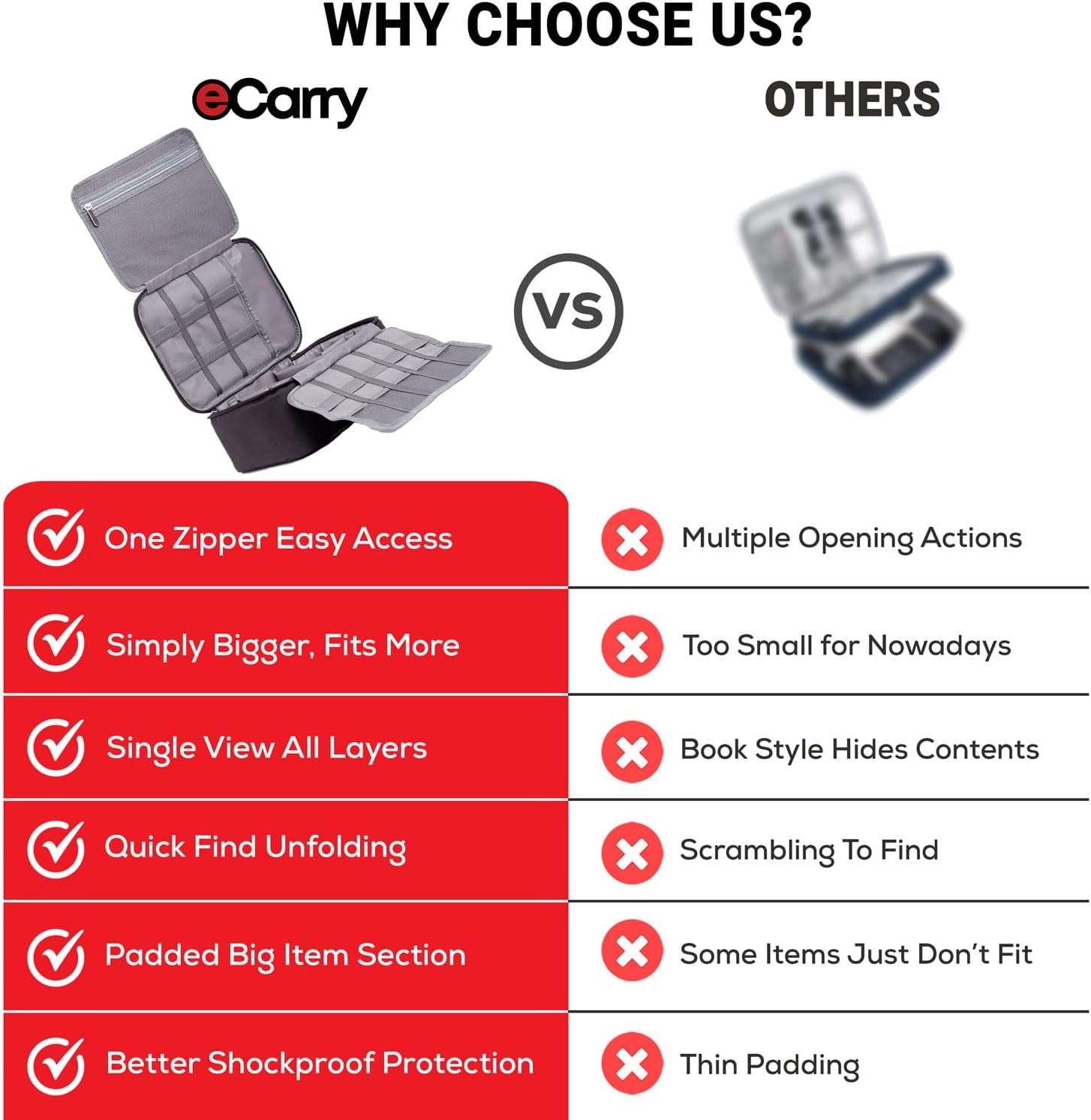- The only electronic organizer travel case you will need: Enjoy quick access to your electronic accessories with the eCarry electronic organizer travel case! This travel essentials cable organizer bag was designed with your convenience in mind, offering effortless access and ensuring easy carrying and effective storage! This is the perfect travel solution for cable management.