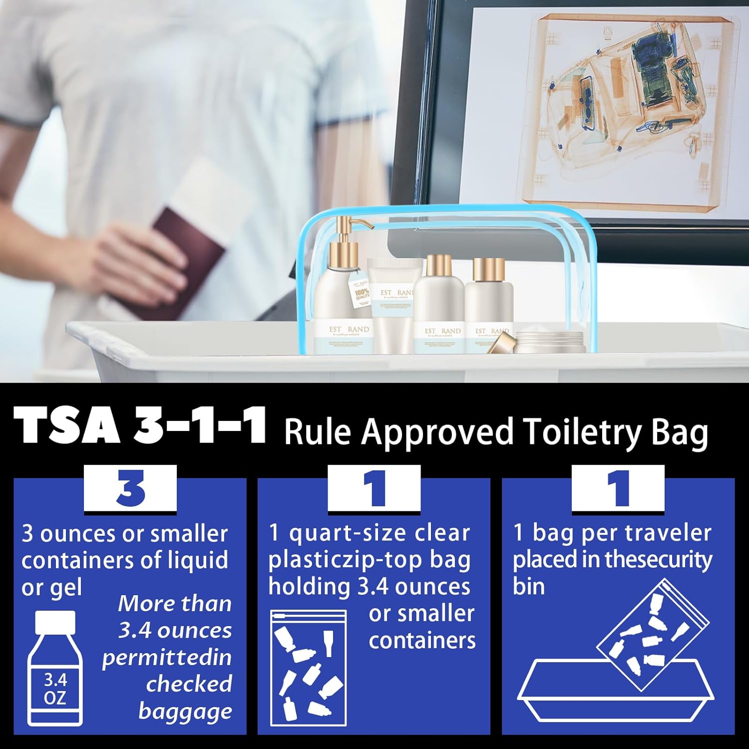 - TSA Approved Clear Toiletry Bag Carry-On Size: Our Bag Size of each is about 7.28"x 2.36"x 5.11"(18.5 X 6 X 13CM). Weight: 0.055lb/ 25.3g. You can carry them anywhere, the enough capacity is suitable to store your small items like lipsticks, eyeshadow and other things; These clear travel bags for toiletries strictly follow 3-1-1 liquids rules for carry-on bag of all airlines. Easy and quick to pass through airport security.