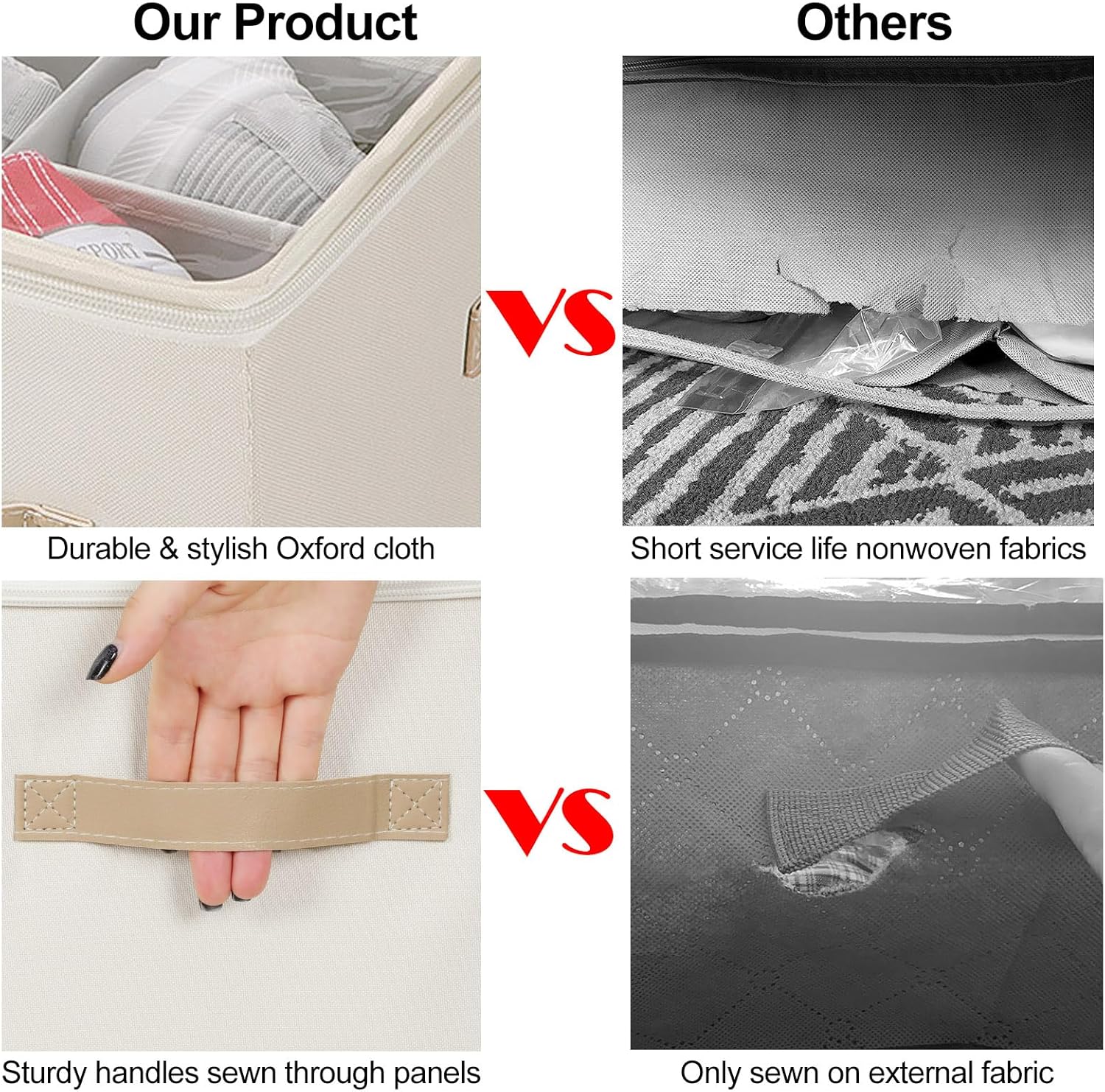 - Durable Materials & High-Quality: High quality Oxford fabric is more durable and stylish compared to non-woven fabrics. The reinforced side boards and inserted bottom ensure that shoe box can maintain its shape even under pulling or other pressure, and will not collapse when empty or full. The reinforced handles allow you to easily remove shoe bin from closet, shelves ect. With no handles on the back to avoid occupying space when placed against the cabinet wall