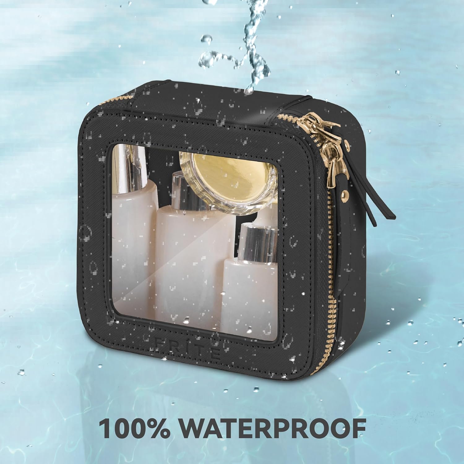 Prite Mini Clear Makeup Bag for Purse Cute Small Travel Cosmetic Bag for Women Waterproof Toiletry Bag Leather Makeup Pouch with Gold Zipper(Black)