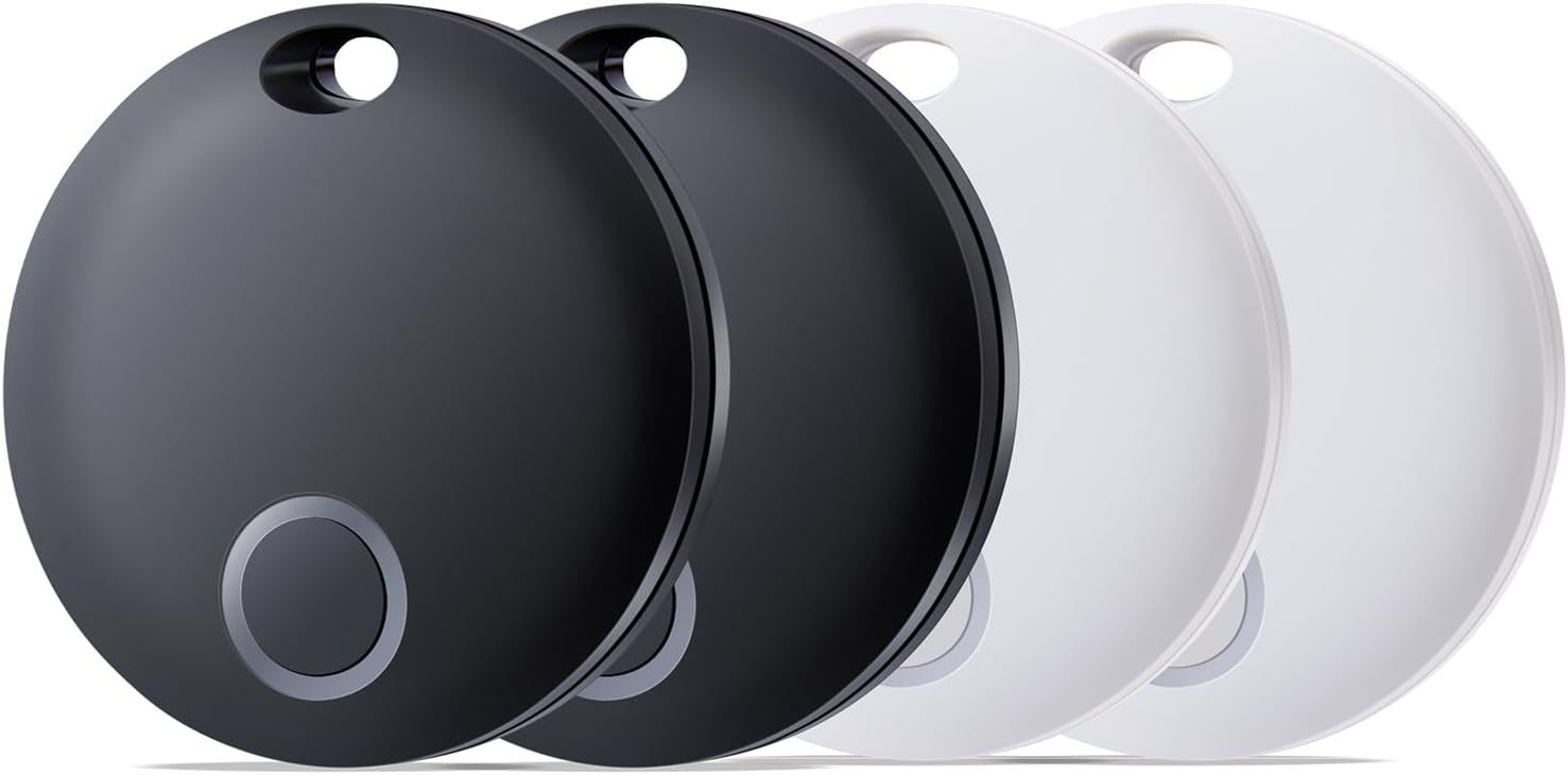 Reyke Smart Tag, Bluetooth Luggage Tracker, Works with Apple Find My (iOS Only), Item Locator for Key, Luggage, Backpack, Wallet, IP67 Waterproof, 4 Pack, Black+White