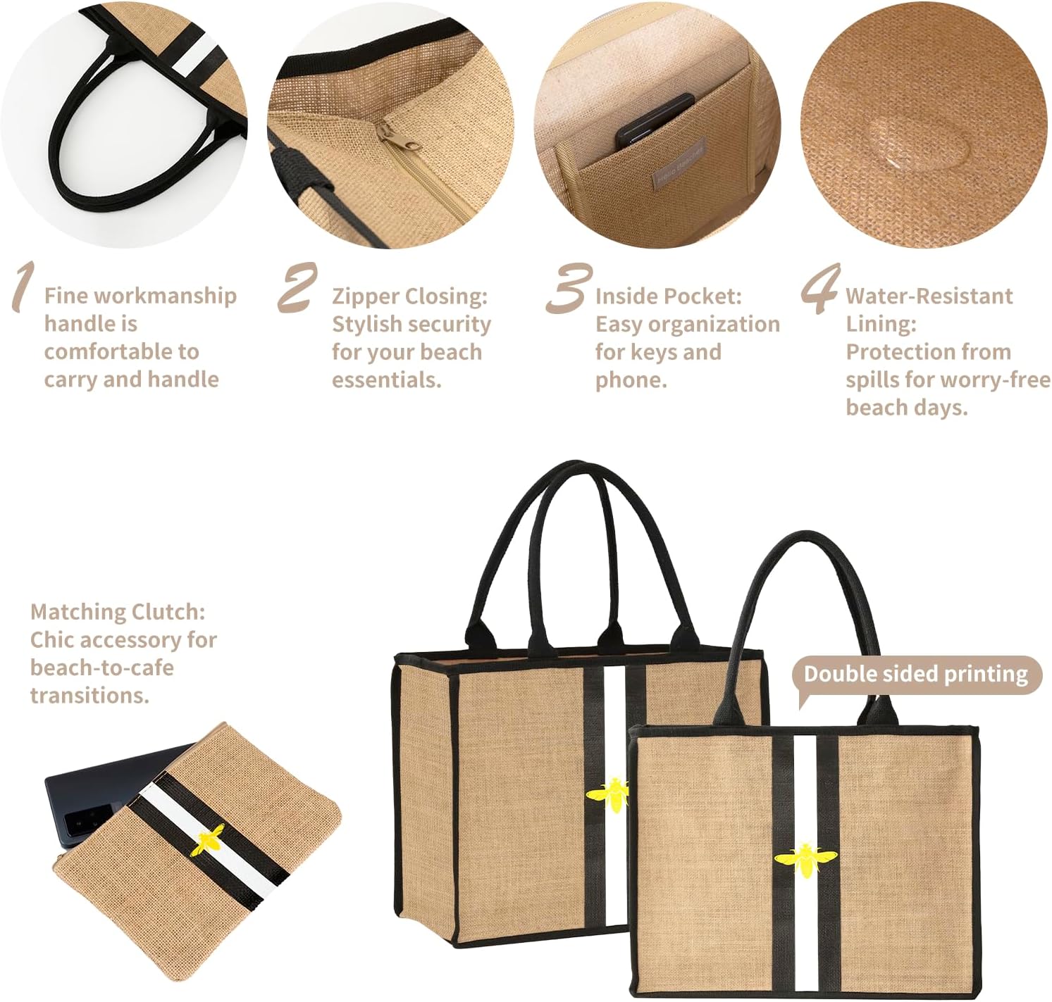 - Pack and Go: Our burlap tote keeps your items organized. Featuring an interior pocket for keys, sunglasses, or a phone. BONUS a matching mini bag to use as a beach purse, beach clutch, makeup bag, beach wallet, or store a wet bathing suit. Perfect for keeping your valuables secure or using it as a standalone accessory.