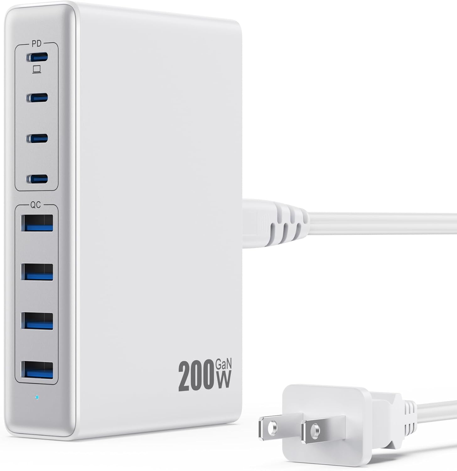 200W USB C Charger Block,GaN IV Charging Station 8 Ports,QC4.0 Fast Charging Station Hub+PD 65W USB C Laptop Charger Adapter Compatible with MacBook Air/Pro,DELL,iPhone 16/15,iPad,Steam Deck-White
