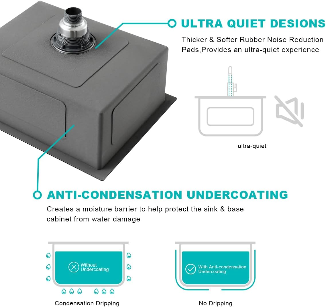- 【Sound Dampening】The stainless sink original Anti-Noise technology with Thick heavy-duty coating and extra-thick rubber padding covering over 95% the sink to absorbs vibration and noise from dish washing and collision friction