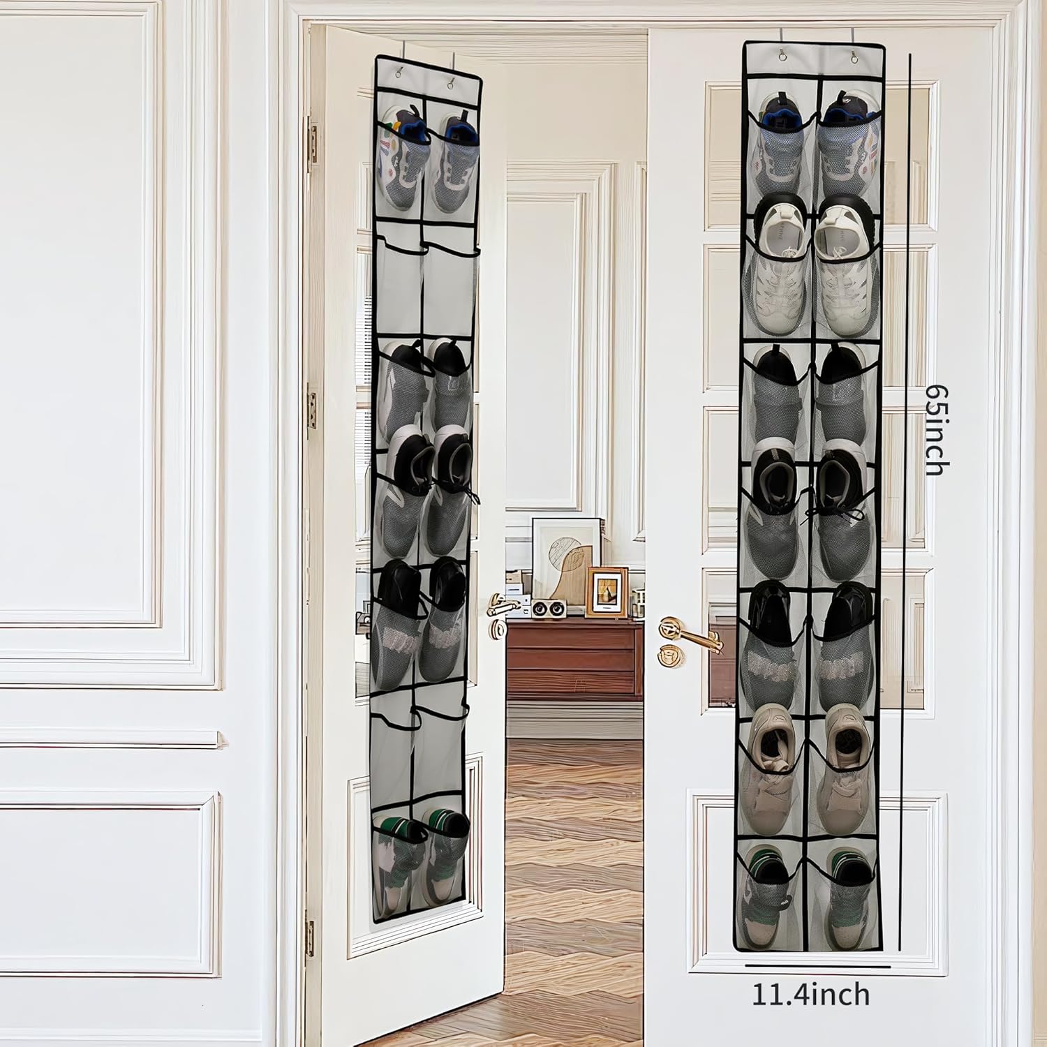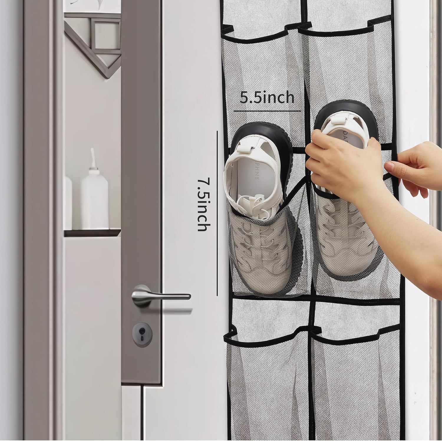 - OVER-DOOR SHOE ORGANIZERS WITH 28 POCKETS: Store 14 pairs of shoes, including women’s heels, sneakers, or men’s size 13 footwear. Reinforced mesh pockets prevent sagging and keep items visible