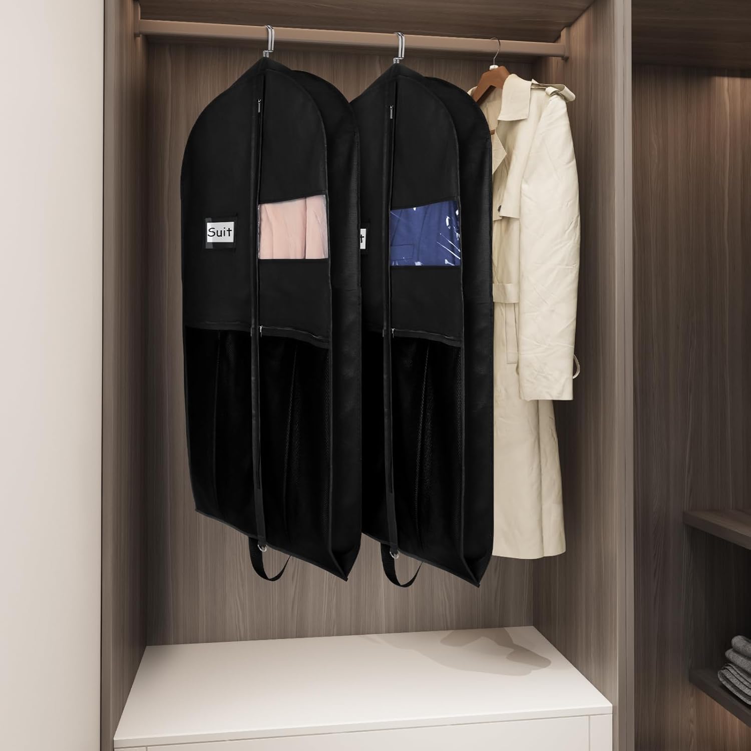 - 【Clear Window】Mens garment bag with a plastic PVC card/tag holder for identification; the clear window allows you to see which suit is inside without opening the bag, double handles allow you to transport without dragging your suit,coat,dress on the ground.