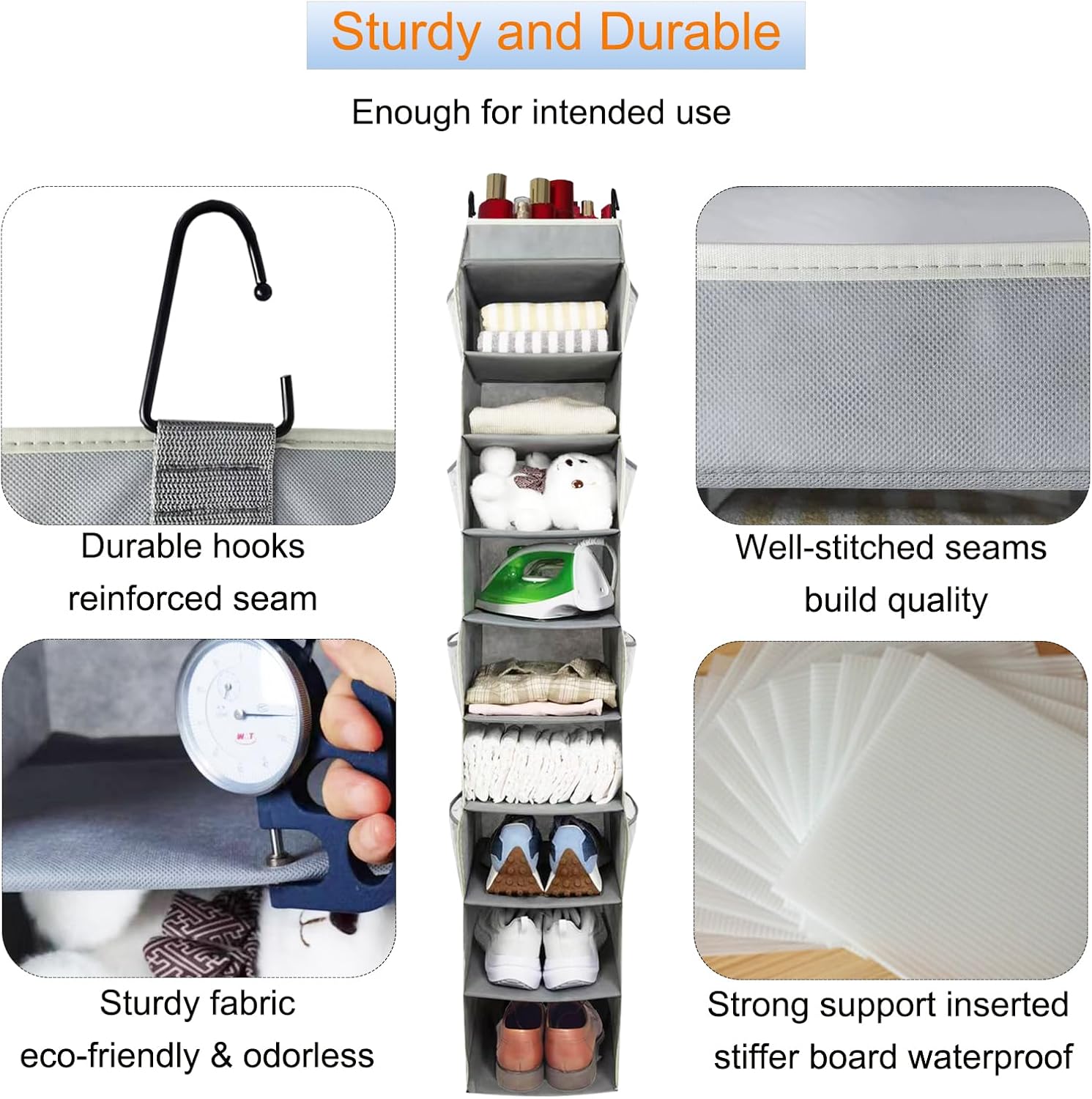- ăDurable and SturdyăRoomtalk 10 secion hanging shoe shelves is designated more durable than others, comes with 2 stable hooks system to hang up weights comparatively about 22 Lbs perfectly, heavy duty fabric eco-friendly , breathable, smell-less, covered inserted with stiffer bottom strong support on each cubby without floppy or tilt.