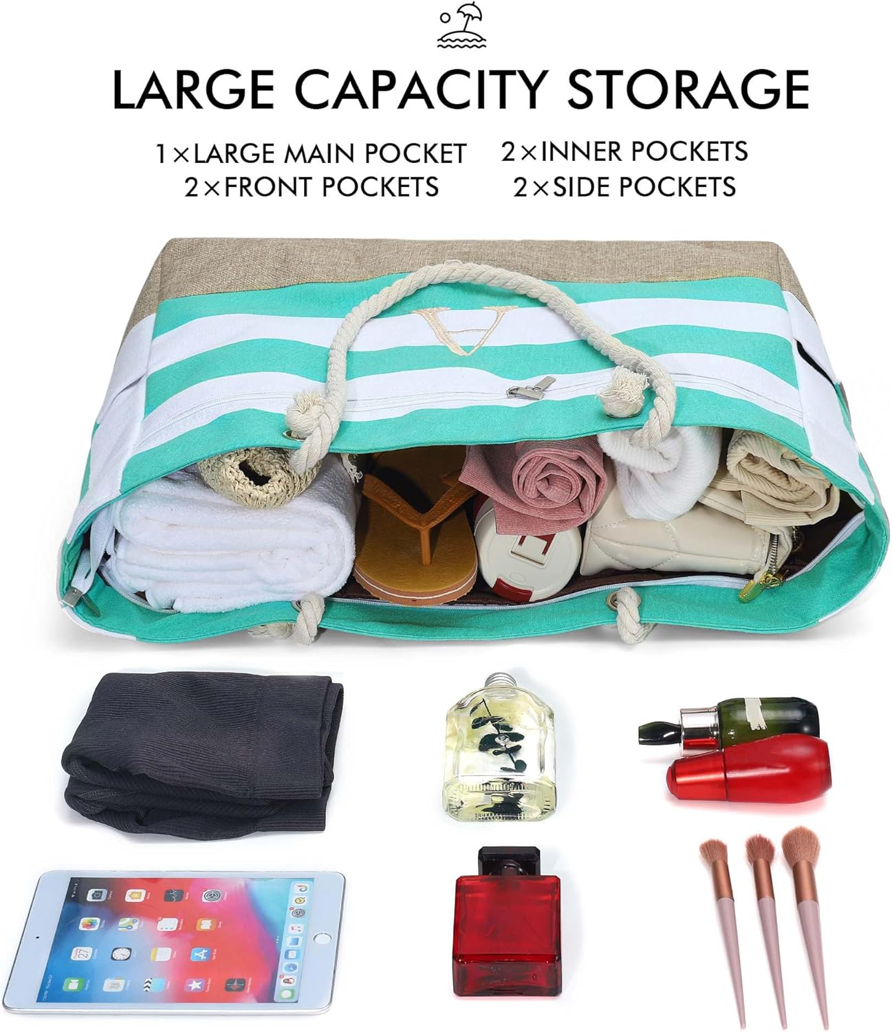 • COMFORTABLE DESIGN : The lightweight and foldable cotton beach tote bag is easy to clean and carry. It features a top zipper closure & inner lining design. Perfect for travel, beach, vacation, swim pool bag, work bag, weekend bag, cruise must haves, everyday bag, etc