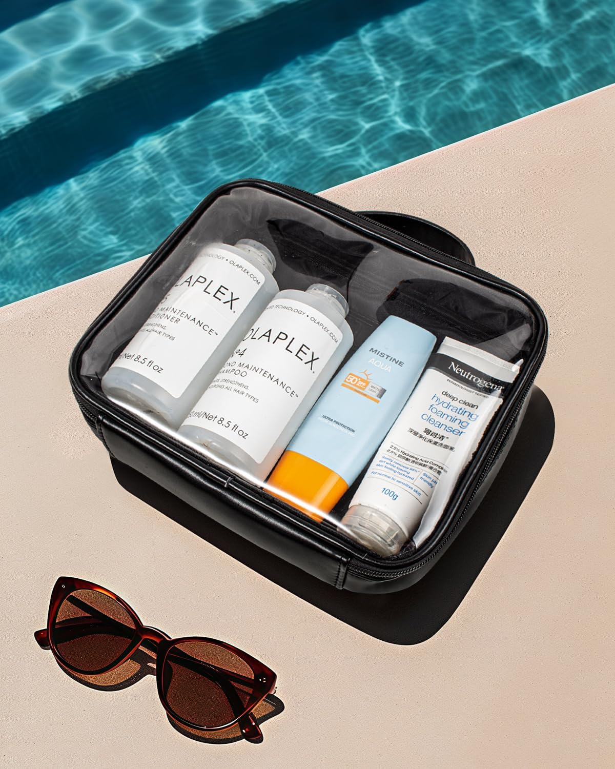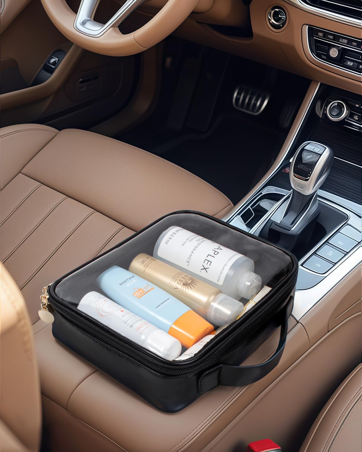 - ✈️CAR MUST HAVE ESSENTIALS CLEAR MAKEUP BAG : Large Size Measuring 9.84'' x 7.67'' x 3.14''(25cm x19.5cm x 8cm), Mini Size 5'' x 4.7'' x 2''(12.7cm x 12cm x 5cm), our clear makeup bag is elegant ,and stylish, this makeup travel organizer was designed in a minimalist boxy shape and Crafted in beautiful PU leather and finished with polished hardware, the trendy makeup bag is easy to carrying in your handbag or carry-on.